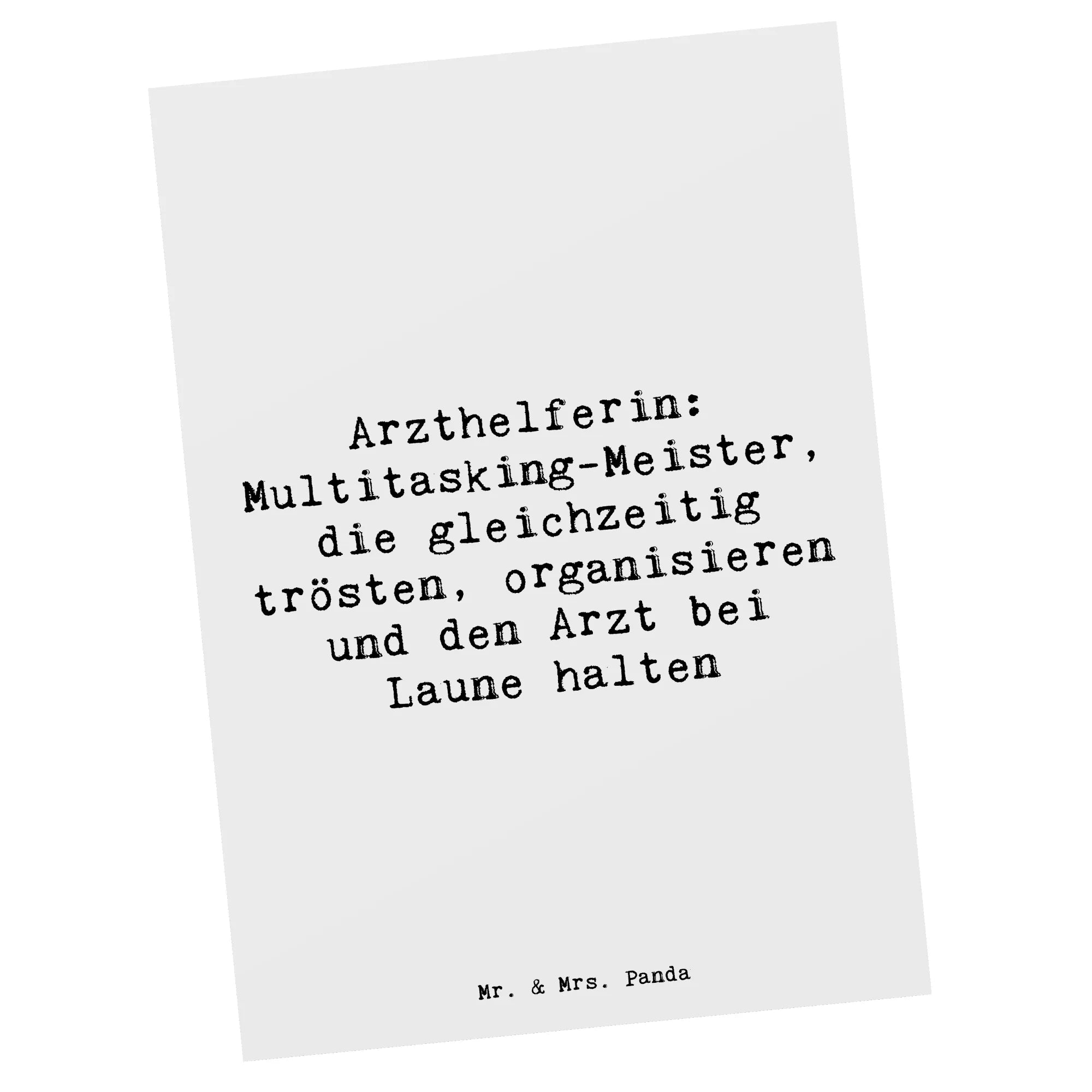 Suchst du nach dem perfekten Geschenk für die fleißige Arzthelferin in deinem Leben? Dann ist die Postkarte "Arzthelferin: Multitasking-Meister, die gleichzeitig trösten, organisieren und den Arzt bei Laune halten" von Mr. & Mrs. Panda genau das Richtige! Diese einzigartige Postkarte aus der liebevoll gestalteten Kollektion Berufe ist ein wahres Highlight und eignet sich hervorragend als Grußkarte, Dankeskarte oder sogar als Einladung.