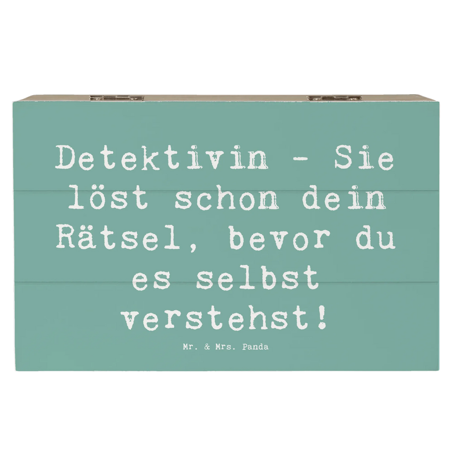 Der Spruch "Detektivin - Sie löst schon dein Rätsel, bevor du es selbst verstehst!" verleiht der Kiste einen charmanten Charakter und macht sie zum idealen Geschenk für alle, die Geheimnisse lieben und gerne rätseln.