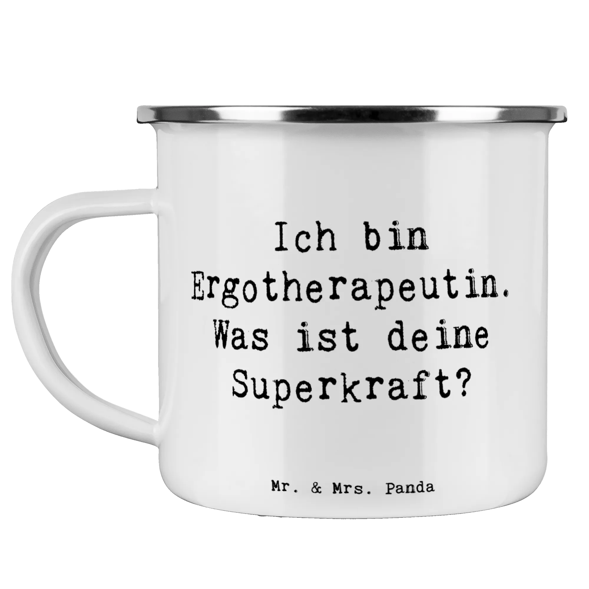 Die Camping Emaille Tasse 'Ich bin Ergotherapeutin. Was ist deine Superkraft?' von Mr. & Mrs. Panda ist das perfekte Accessoire für alle Ergotherapeuten und Ergotherapeutinnen! Egal, ob beim Camping, Wandern oder einfach zu Hause im Garten – diese Tasse ist super praktisch und leicht! Mit einem Füllvermögen von 300 ml bietet sie genug Platz für deine Lieblingsgetränke, sei es Kaffee, Tee oder heiße Schokolade. Der einzigartige Spruch auf der Tasse strahlt Wärme und Freude aus und macht sie zu einem liebevollen Geschenk für jeden Anlass.