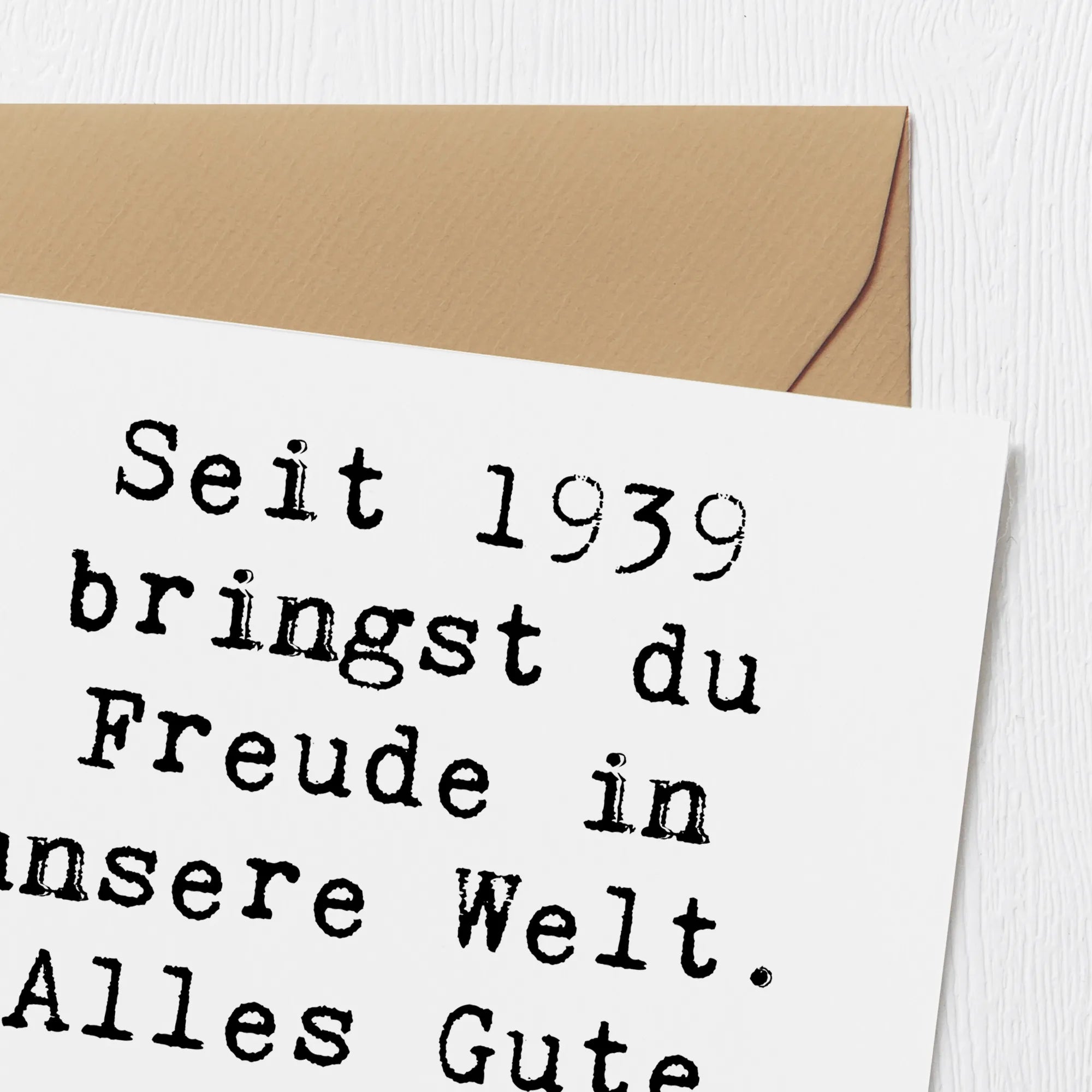 Mit dem zauberhaften Spruch "Seit 1939 bringst du Freude in unsere Welt. Alles Gute zum Geburtstag!" auf der Vorderseite ist die Karte mehr als nur ein Stück Papier – sie erzählt Geschichten und schafft Erinnerungen. Auf der blanko Innenseite hast du genügend Platz für deine eigenen Worte. Die Karte ist aus edlem 300 Gramm Karton gefertigt und besticht durch eine hochglänzende Veredelung auf der Vorderseite. Sie kommt inklusive einem eleganten Umschlag, der den Gesamteindruck abrundet.