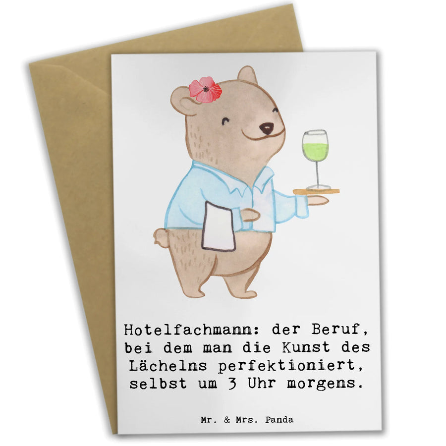 Die Grußkarte "Hotelfachmann" aus der liebevollen Berufe-Kollektion von Mr. & Mrs. Panda ist das perfekte Geschenk für all jene, die im Gastgewerbe tätig sind. Ob zur Hochzeit, zum Geburtstag oder einfach als nette Geste für einen Kollegen – diese Karte bringt Freude und Wertschätzung auf besondere Art und Weise zum Ausdruck.