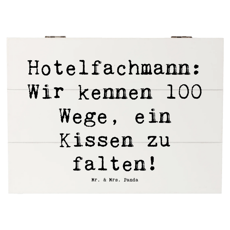 Die Holzkiste Hotelfachmann von Mr. & Mrs. Panda ist der perfekte Begleiter für alle Hotelfachleute und die, die es werden wollen! Mit dem charmanten Spruch "Hotelfachmann: Wir kennen 100 Wege, ein Kissen zu falten!" wird diese Kiste zum individuellen Aufbewahrungsort für Erinnerungen, kleine Schätze und besondere Andenken.