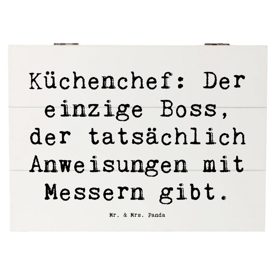 Entdecke die wunderschöne Holzkiste von Mr. & Mrs. Panda, die nicht nur eine charmante Aufbewahrungslösung darstellt, sondern auch ein echtes Highlight in jedem Haushalt ist! Diese besondere Kiste ist mit dem lustigen Spruch "Küchenchef: Der einzige Boss, der tatsächlich Anweisungen mit Messern gibt." bedruckt. Ideal für alle, die die Kunst des Kochens lieben!