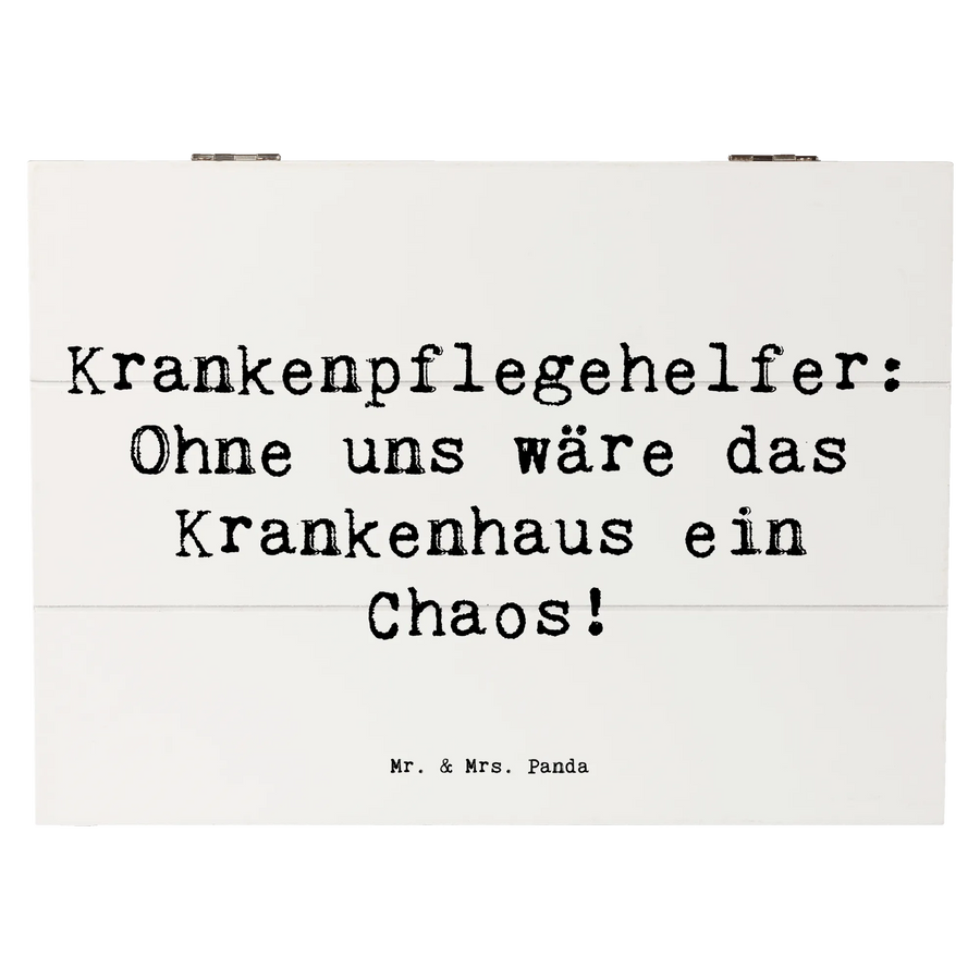 Die Holzkiste "Krankenpflegehelfer: Ohne uns wäre das Krankenhaus ein Chaos!" von Mr. & Mrs. Panda ist das perfekte Geschenk für alle, die im Gesundheitswesen arbeiten, insbesondere für Pflegekräfte. Diese wunderschöne Erinnerungsbox bietet nicht nur einen praktischen Stauraum für persönliche Schätze, sondern strahlt auch eine ganz besondere Wertschätzung für diesen wichtigen Beruf aus. Mit den Maßen von 25 x 18 cm passt sie ideal auf jeden Schreibtisch oder ins Wohnzimmer und wird zum stilvollen Blickfang.