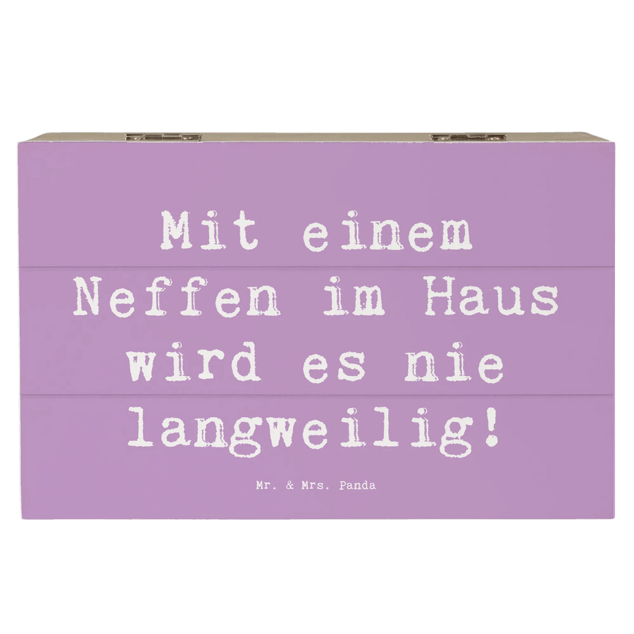 Die Holzkiste "Für meinen Neffen" von Mr. & Mrs. Panda ist das perfekte Geschenk für all jene, die ihren Neffen eine besondere Freude bereiten möchten. Diese wunderschöne Kiste mit dem liebevollen Spruch "Mit einem Neffen im Haus wird es nie langweilig!" ist nicht nur ein toller Blickfang, sondern bietet auch einen idealen Aufbewahrungsort für all die kleinen Schätze, die sich im Laufe der Zeit ansammeln.