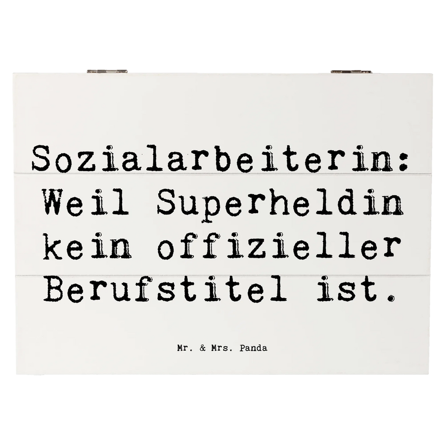 Mr. & Mrs. Panda Holzkiste „Sozialarbeiterin“ – Die perfekte Erinnerungskiste für alle Heldinnen des Sozialwesens. Auf der Vorderseite findest Du den liebevollen Spruch „Sozialarbeiterin: Weil Superheldin kein offizieller Berufstitel ist.“, handgezeichnet im typischen Aquarellstil von Mrs. Panda.