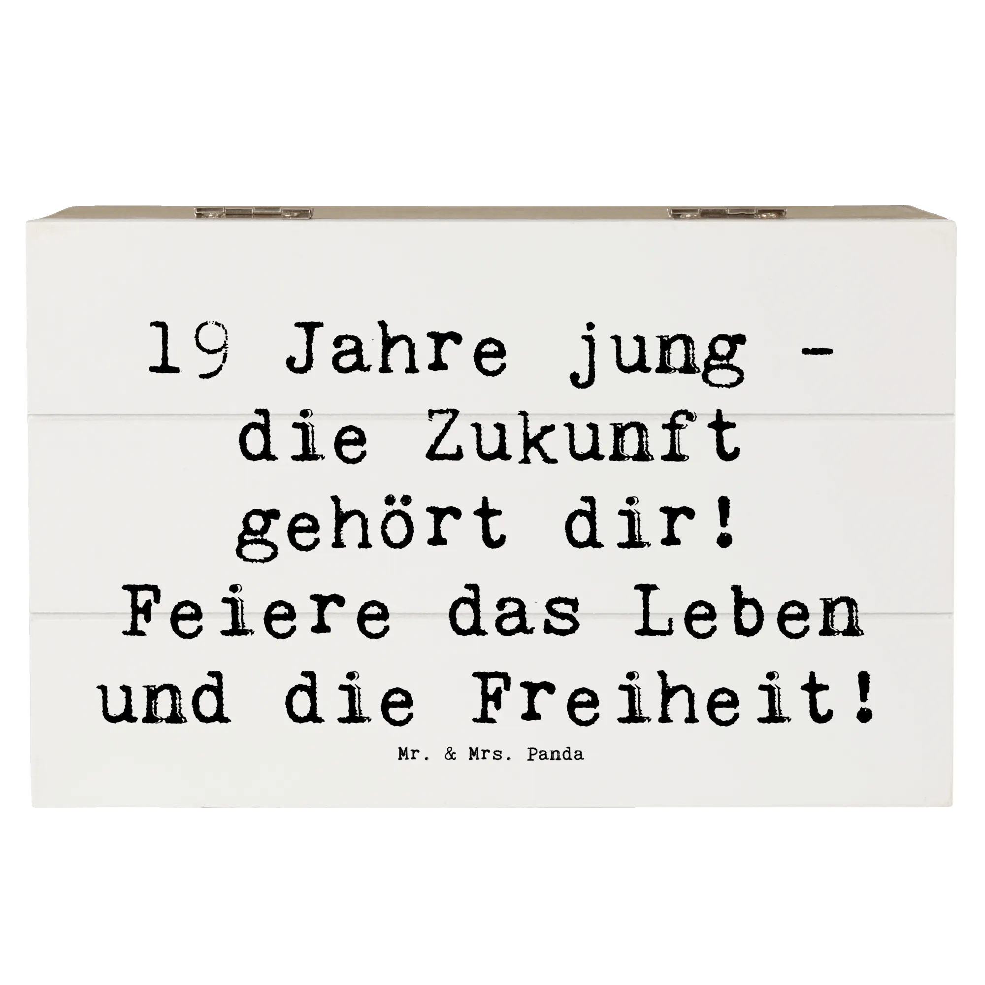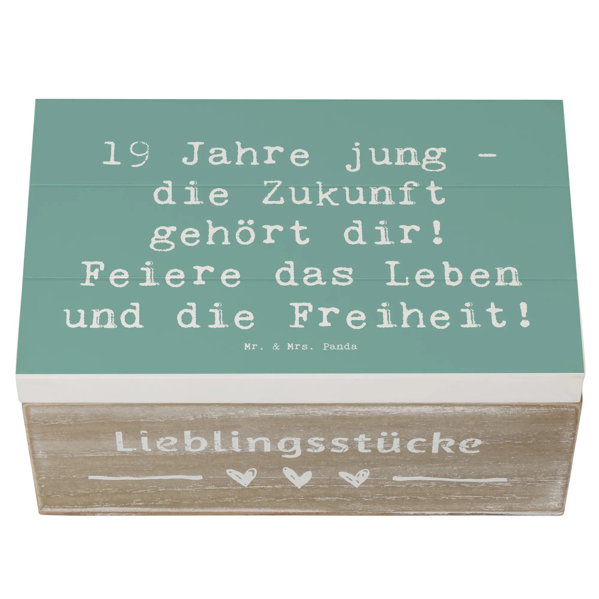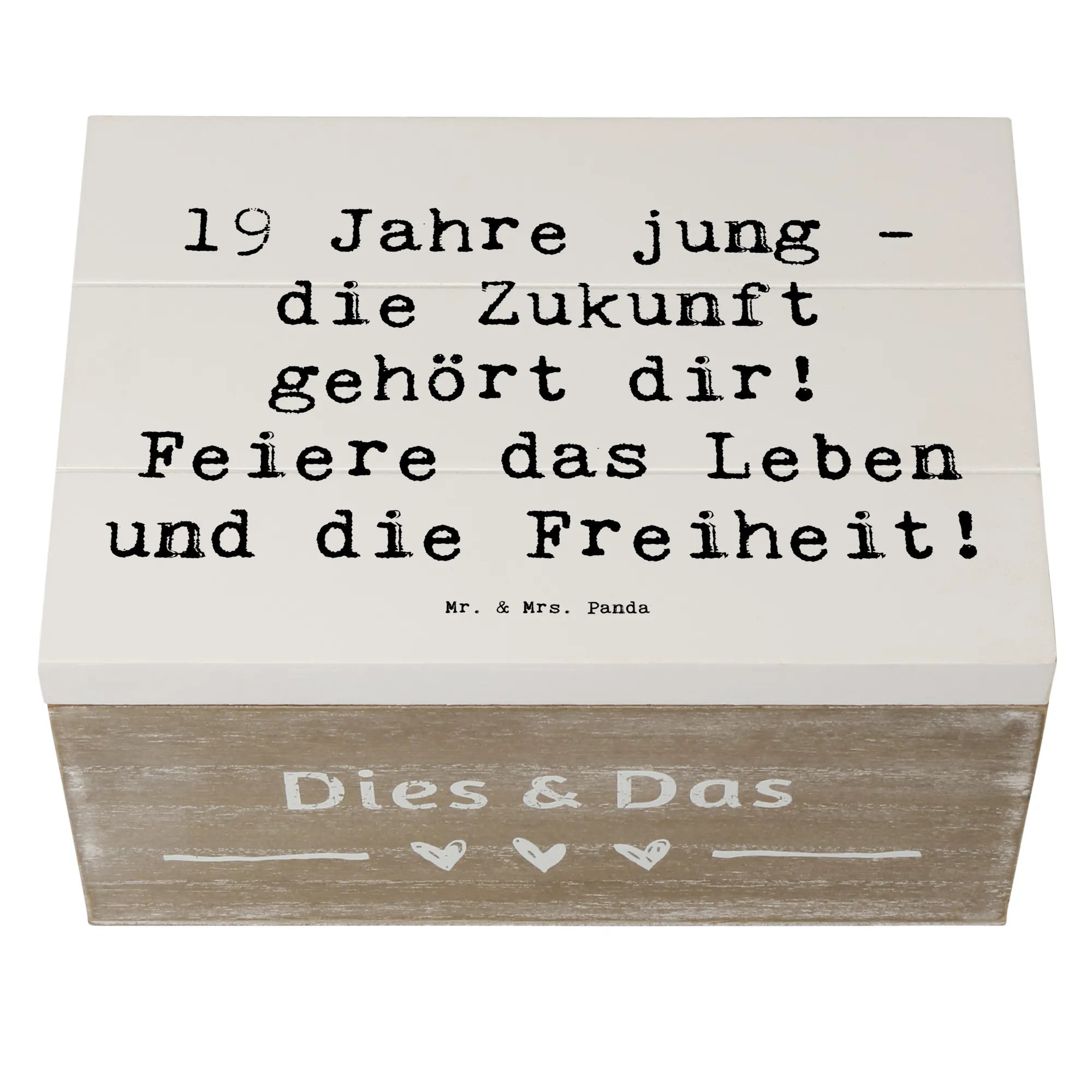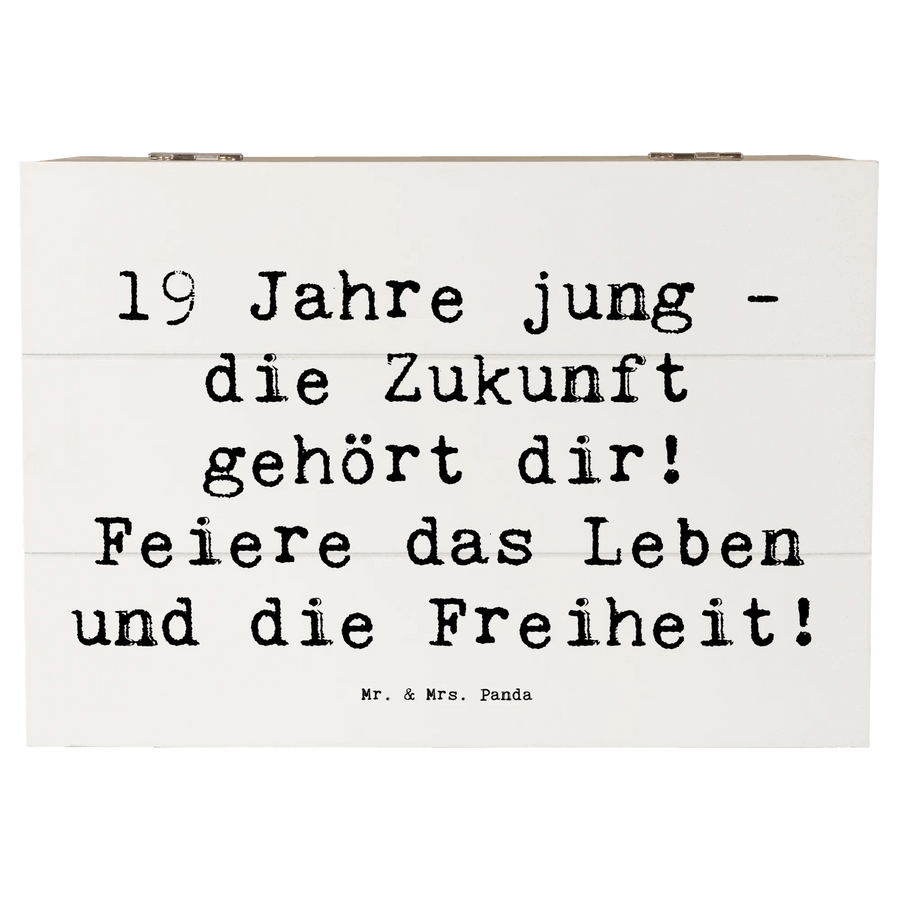 Die wunderschöne Holzkiste von Mr. & Mrs. Panda ist nicht nur eine Kiste, sondern ein ganz besonderes Geschenk zur Feier des 19. Geburtstags! Mit dem inspirierenden Spruch '19 Jahre jung - die Zukunft gehört dir! Feiere das Leben und die Freiheit!' macht diese Schatzkiste aus robuster Holzfaser jede Feier zu einem unvergesslichen Erlebnis.