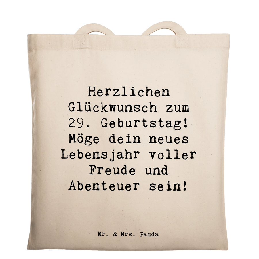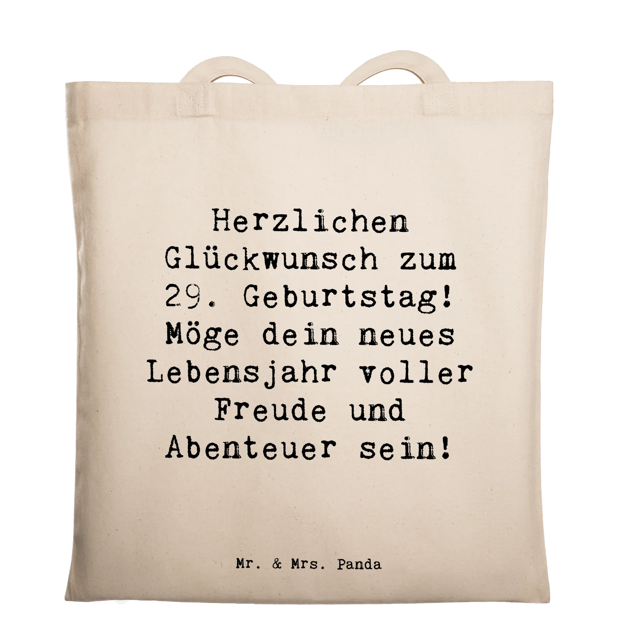 Suchst du das perfekte Geschenk für einen besonderen Menschen, der seinen 29. Geburtstag feiert? Unsere wunderschöne Tragetasche von Mr. & Mrs. Panda ist genau das Richtige! Mit dem süßen Motiv "Herzlichen Glückwunsch zum 29. Geburtstag! Möge dein neues Lebensjahr voller Freude und Abenteuer sein!" wird diese Tasche zu einem unvergesslichen Begleiter.