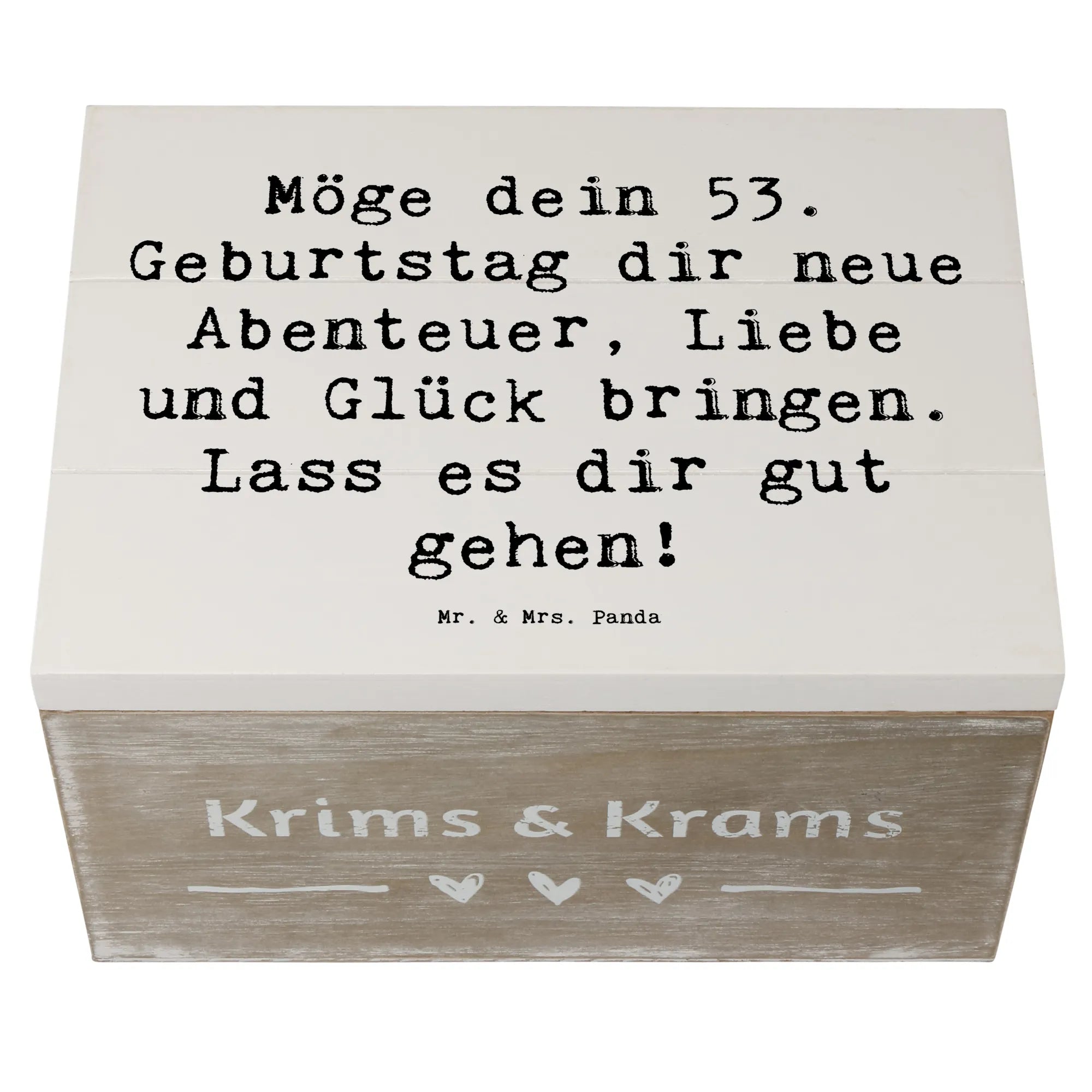 Sie wurde mit einem niedlichen Motiv zum 53. Geburtstag bedruckt, das mit dem Slogan "Möge dein 53. Geburtstag dir neue Abenteuer, Liebe und Glück bringen. Lass es dir gut gehen!" versehen ist. Dieser Spruch macht die Kiste zu einem ganz besonderen Erinnerungsstück.