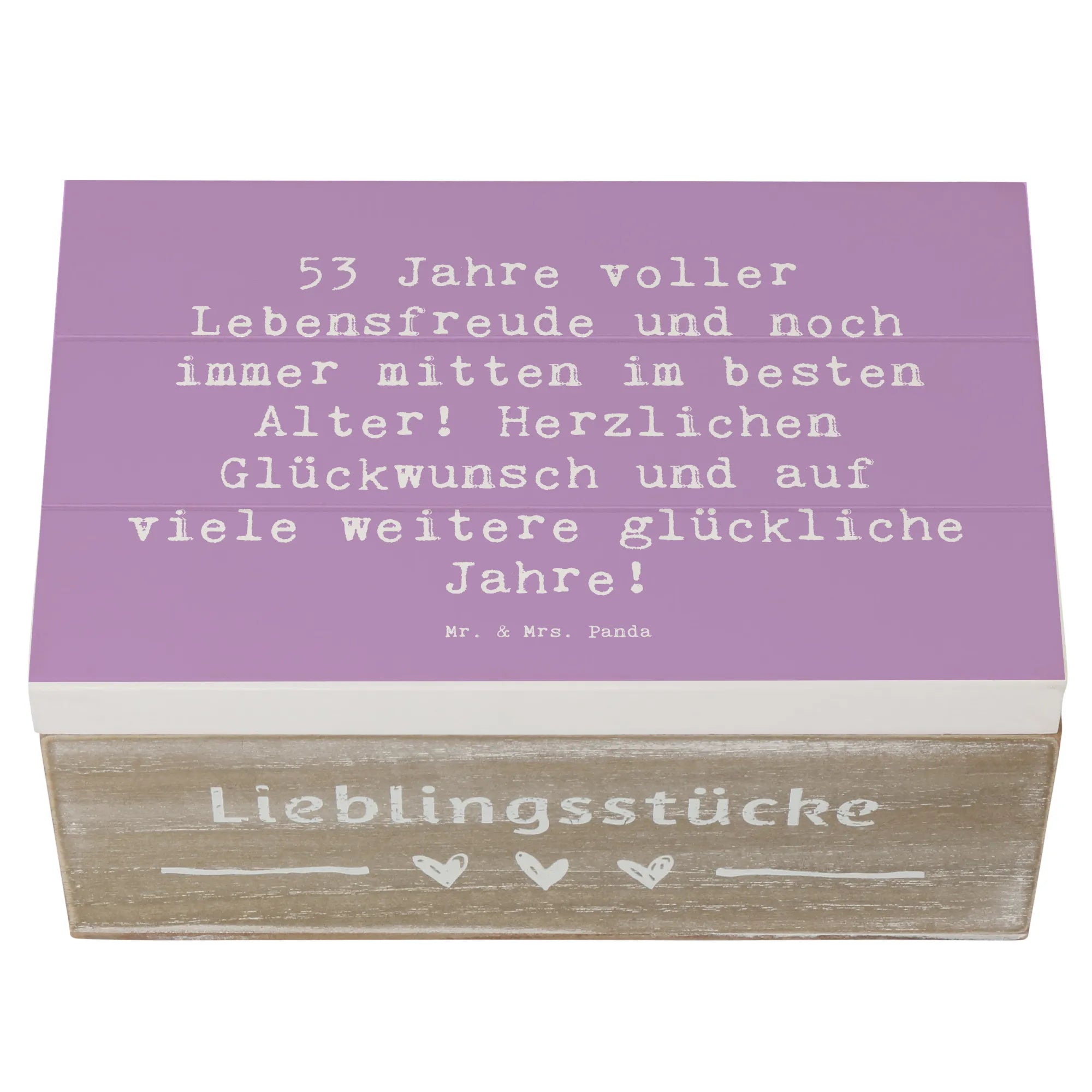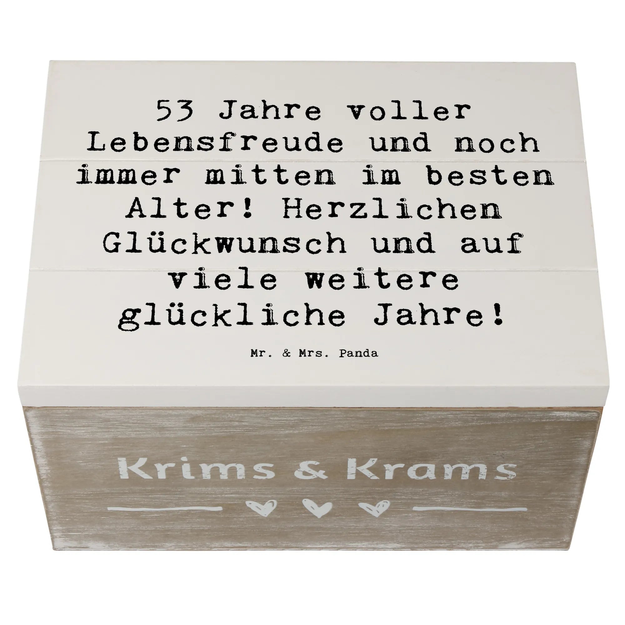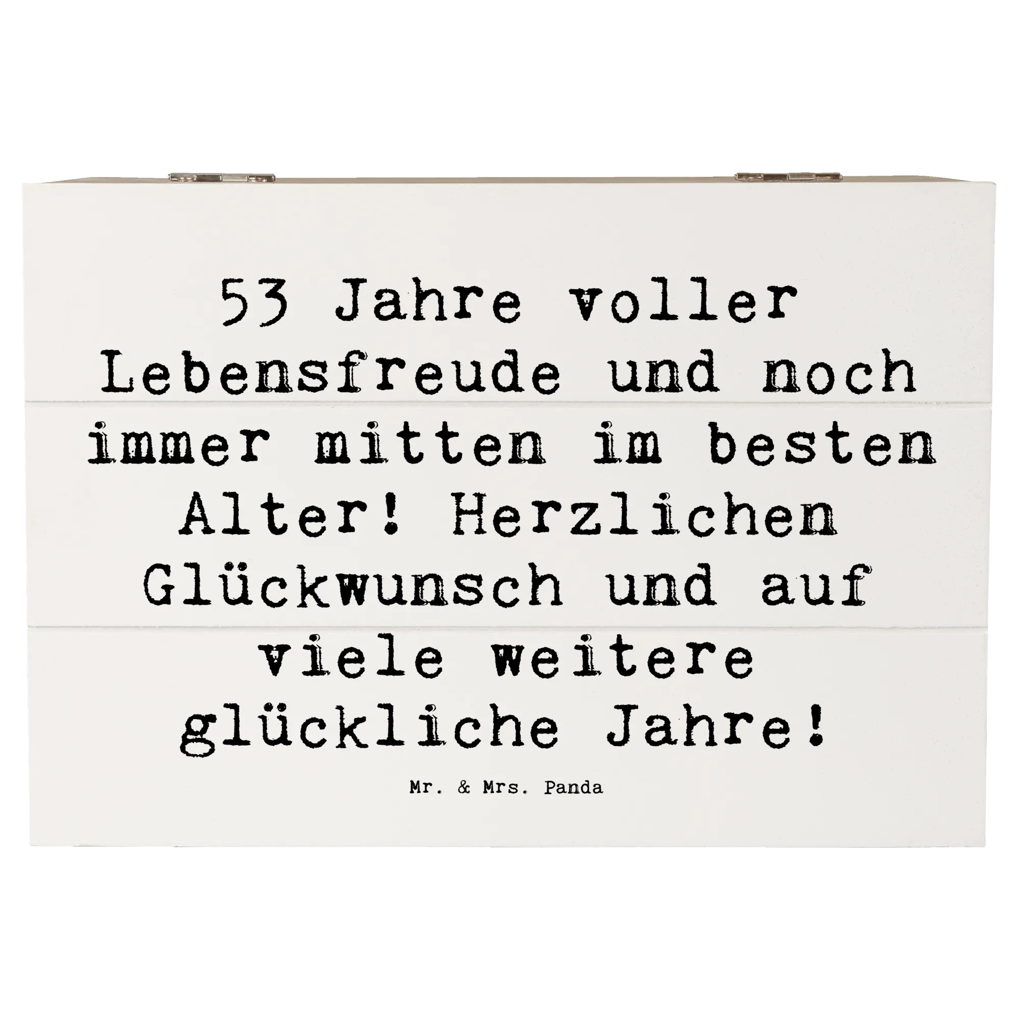Die wunderschöne Holzkiste von Mr. & Mrs. Panda zum 53. Geburtstag ist das perfekte Geschenk für das Geburtstagskind, das voller Lebensfreude stecken soll! Mit dem liebevollen Spruch "53 Jahre voller Lebensfreude und noch immer mitten im besten Alter! Herzlichen Glückwunsch und auf viele weitere glückliche Jahre!" wird diese Kiste zu einem ganz besonderen Hingucker.