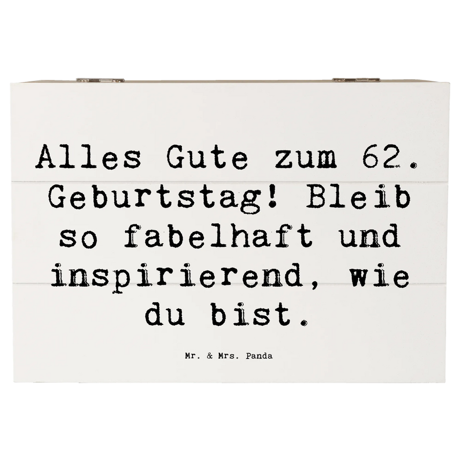 Entdecke die bezaubernde Holzkiste von Mr. & Mrs. Panda, die das perfekte Geschenk zum 62. Geburtstag ist! Diese außergewöhnliche Erinnerungskiste ist nicht nur ein liebevolles Präsent, sondern auch ein stilvoller Aufbewahrungsort für all die besonderen Schätze, die Du im Laufe der Jahre gesammelt hast.