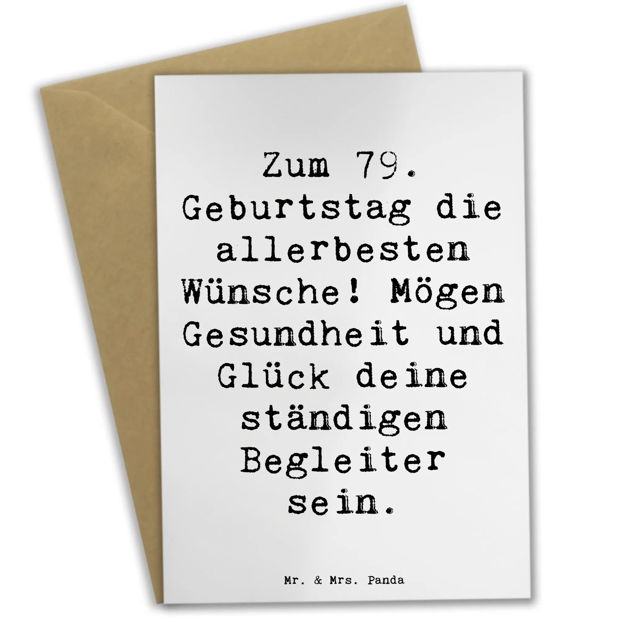 Feiere den 79. Geburtstag deines Liebsten oder deiner Liebsten mit unserer liebevollen Grußkarte von Mr. & Mrs. Panda! Diese wunderschöne Karte, liebevoll gestaltet mit einem herzerwärmenden Spruch, ist der perfekte Begleiter für diesen ganz besonderen Tag. Auf der Vorderseite erwartet dich der bezaubernde Text: "Zum 79. Geburtstag die allerbesten Wünsche! Mögen Gesundheit und Glück deine ständigen Begleiter sein." Diese Botschaft sorgt für ein Lächeln und wirkt wie ein Lichtblick an einem besonderen Tag.