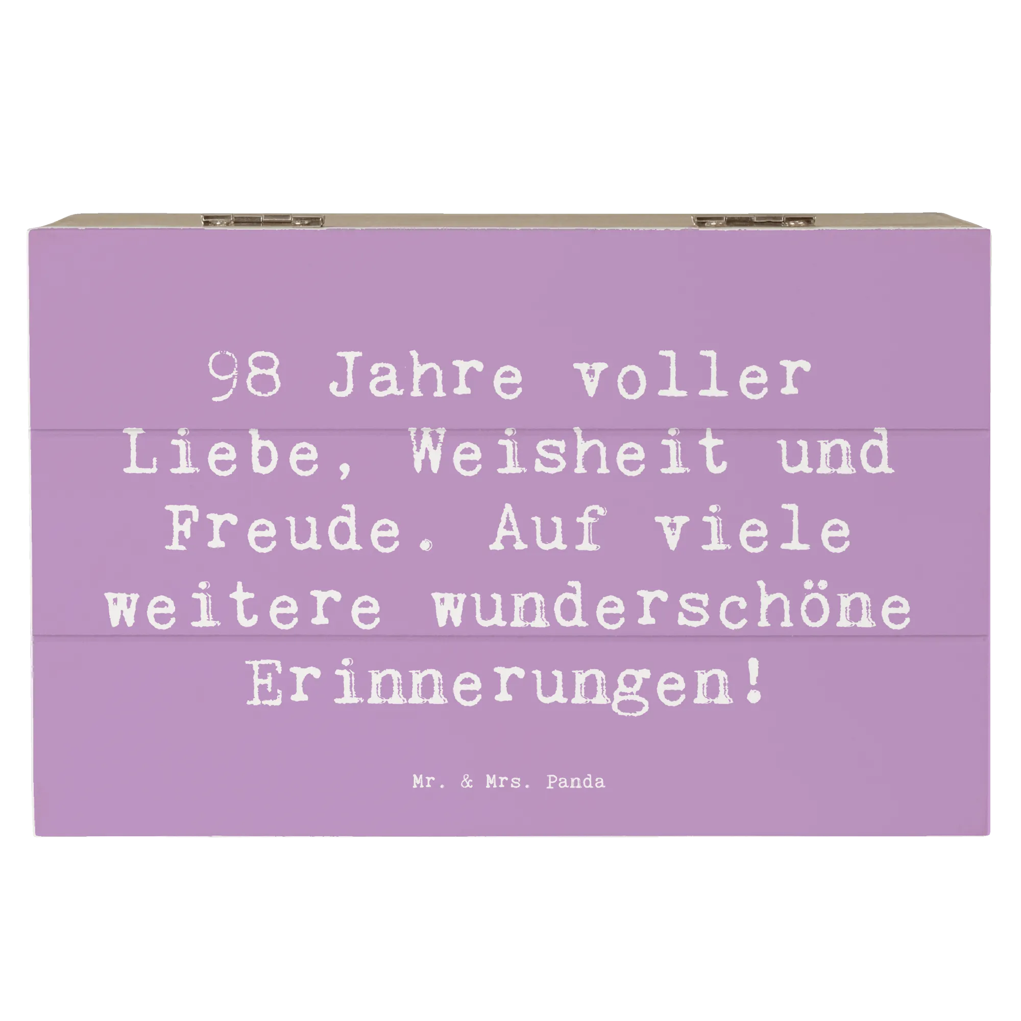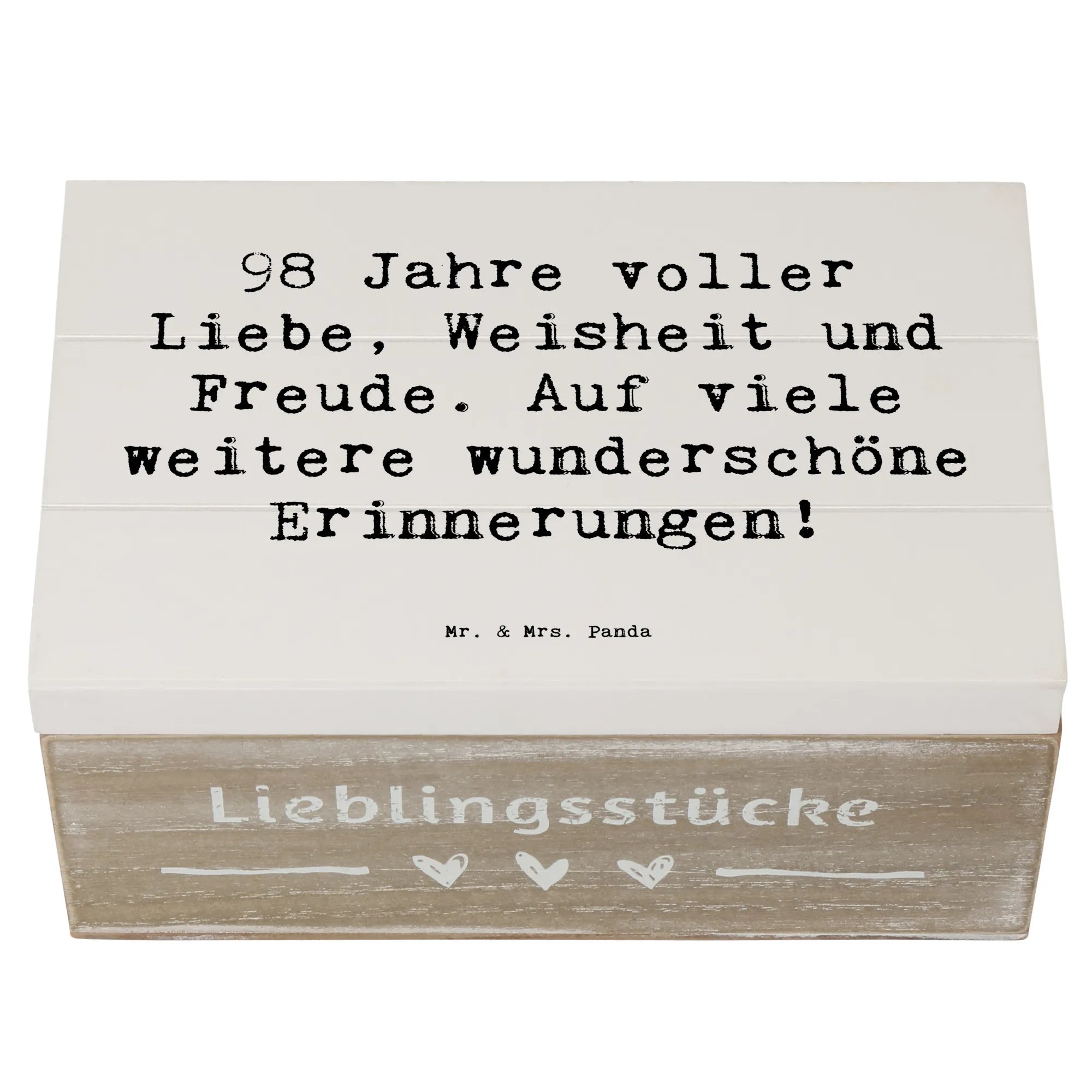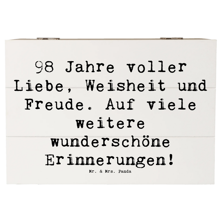 Die wunderschöne Holzkiste von Mr. & Mrs. Panda ist das perfekte Geschenk zum 98. Geburtstag. Mit dem liebevollen Motiv "98 Jahre voller Liebe, Weisheit und Freude. Auf viele weitere wunderschöne Erinnerungen!" wird diese Kiste zu einem ganz besonderen Erinnerungsstück.