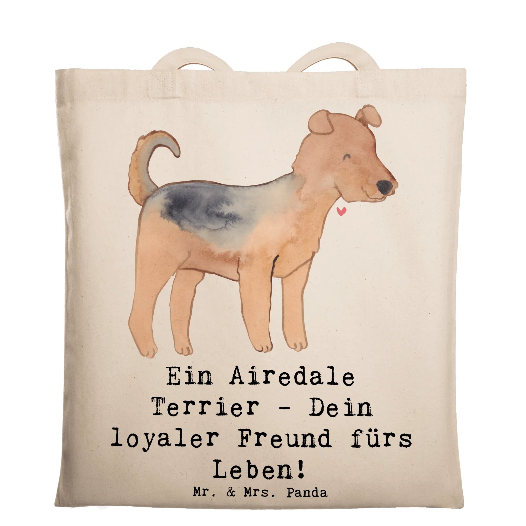 Das Motiv des Airedale Terriers, liebevoll handgezeichnet von Mrs. Panda, kommt mit dem herzlichen Slogan: 'Ein Airedale Terrier - Dein loyaler Freund fürs Leben!' Jung und Alt werden beim Anblick dieser zauberhaften Tragetasche lächeln. Ob zum Einkaufen, als Strandtasche oder für einen Ausflug – diese Tasche ist vielseitig einsetzbar und wird schnell zum allseits beliebten Begleiter.