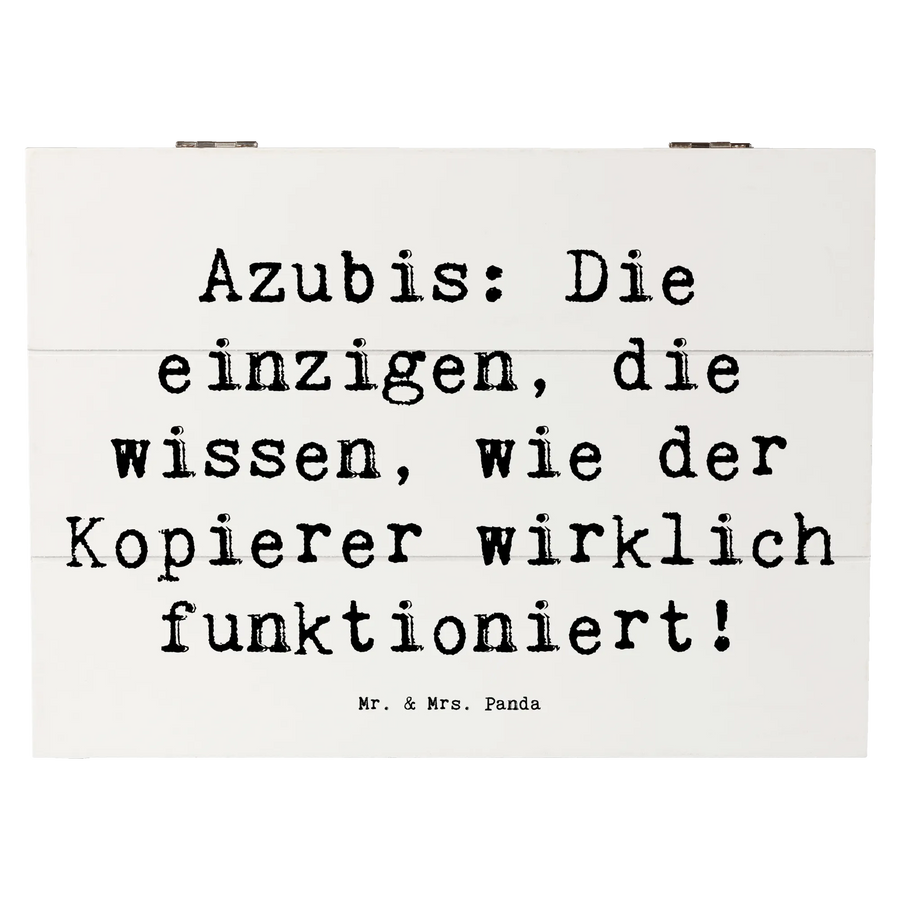 Die wundervolle Holzkiste von Mr. & Mrs. Panda ist der perfekte Aufbewahrungsort für all Deine Schätze! Mit dem liebevollen Motiv "Auszubildende" und dem humorvollen Spruch "Azubis: Die einzigen, die wissen, wie der Kopierer wirklich funktioniert!" ist diese Kiste nicht nur funktional, sondern auch ein echter Blickfang.