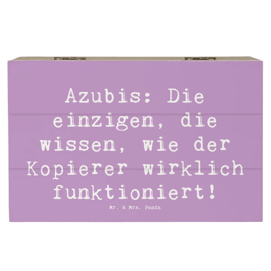 Die wundervolle Holzkiste von Mr. & Mrs. Panda ist der perfekte Aufbewahrungsort für all Deine Schätze! Mit dem liebevollen Motiv "Auszubildende" und dem humorvollen Spruch "Azubis: Die einzigen, die wissen, wie der Kopierer wirklich funktioniert!" ist diese Kiste nicht nur funktional, sondern auch ein echter Blickfang.