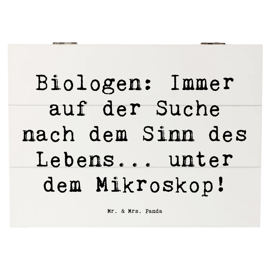 Diese wunderschöne Holzkiste von Mr. & Mrs. Panda ist das perfekte Geschenk für Biologen und alle, die sich für die Natur begeistern. Bedruckt mit dem charmanten Motiv "Biologen: Immer auf der Suche nach dem Sinn des Lebens... unter dem Mikroskop!" bietet diese Kiste nicht nur einen ästhetischen Reiz, sondern auch ausreichend Platz für all Deine wertvollen Erinnerungen – sei es für Fotos, kleine Schätze oder besondere Gegenstände, die Du bewahren möchtest.