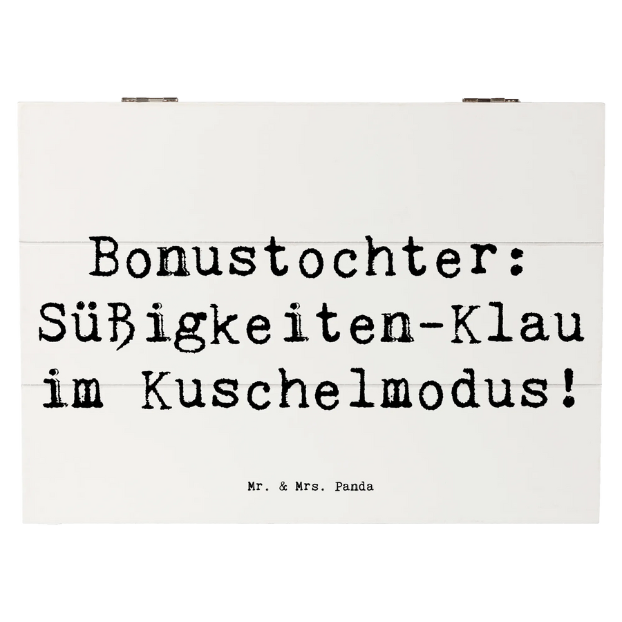 Entdecke die zauberhafte Holzkiste von Mr. & Mrs. Panda, die perfekt für Deine Bonustochter ist! Diese wunderschöne Schatzkiste ist mehr als nur ein Aufbewahrungsort für kleine Schätze. Sie ist ein Ausdruck der besonderen Beziehung, die Du zu Deiner Stieftochter hast. Mit dem charmanten Spruch "Bonustochter: Süßigkeiten-Klau im Kuschelmodus!" zauberst Du ein Lächeln auf ihr Gesicht und zeigst ihr, wie wichtig sie für Dich ist.