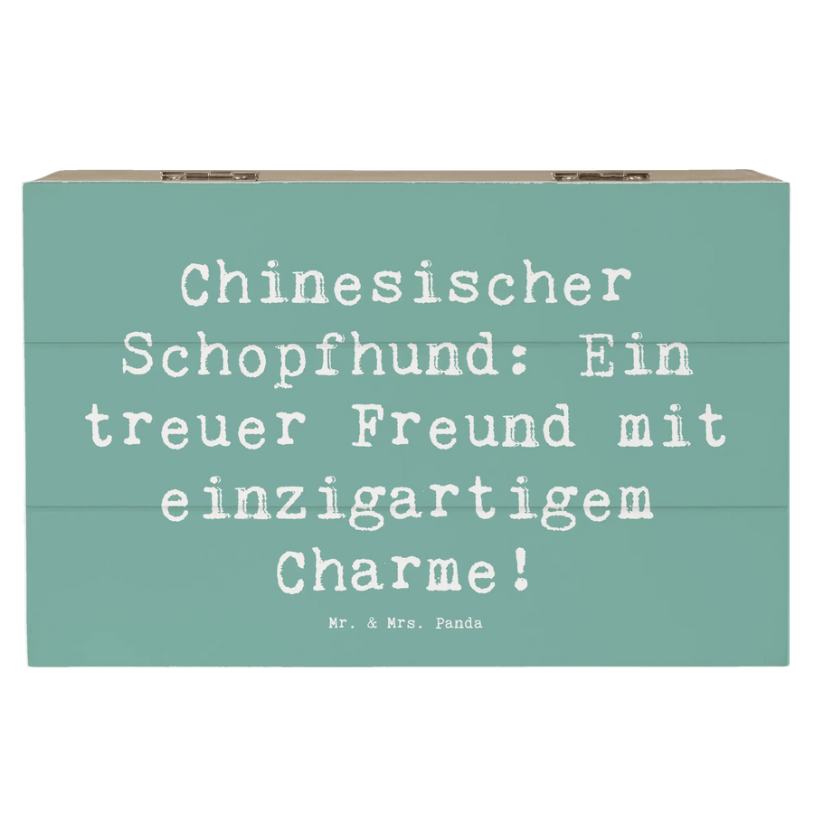 Diese wunderschöne Holzkiste von Mr. & Mrs. Panda ist das perfekte Geschenk für alle Hundefreunde und Liebhaber des Chinesischen Schopfhundes. Mit einem motivierenden Spruch, der lautet: "Chinesischer Schopfhund: Ein treuer Freund mit einzigartigem Charme!" wird diese Kiste zu einem ganz besonderen Erinnerungsort für all deine Schätze.