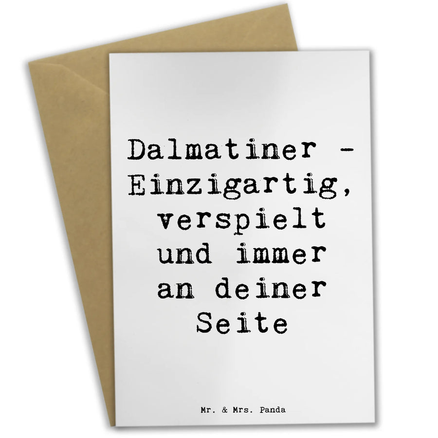 Die Grußkarte "Dalmatiner - Einzigartig, verspielt und immer an deiner Seite" von Mr. & Mrs. Panda ist das perfekte Geschenk, besonders für Hundeliebhaber und Menschen, die einen Dalmatiner in ihrem Herzen tragen. Diese wunderschöne und einzigartige Grußkarte ist aus hochwertigem 300 Gramm Karton gefertigt und kombiniert edles Design mit liebevollen Sprüchen.