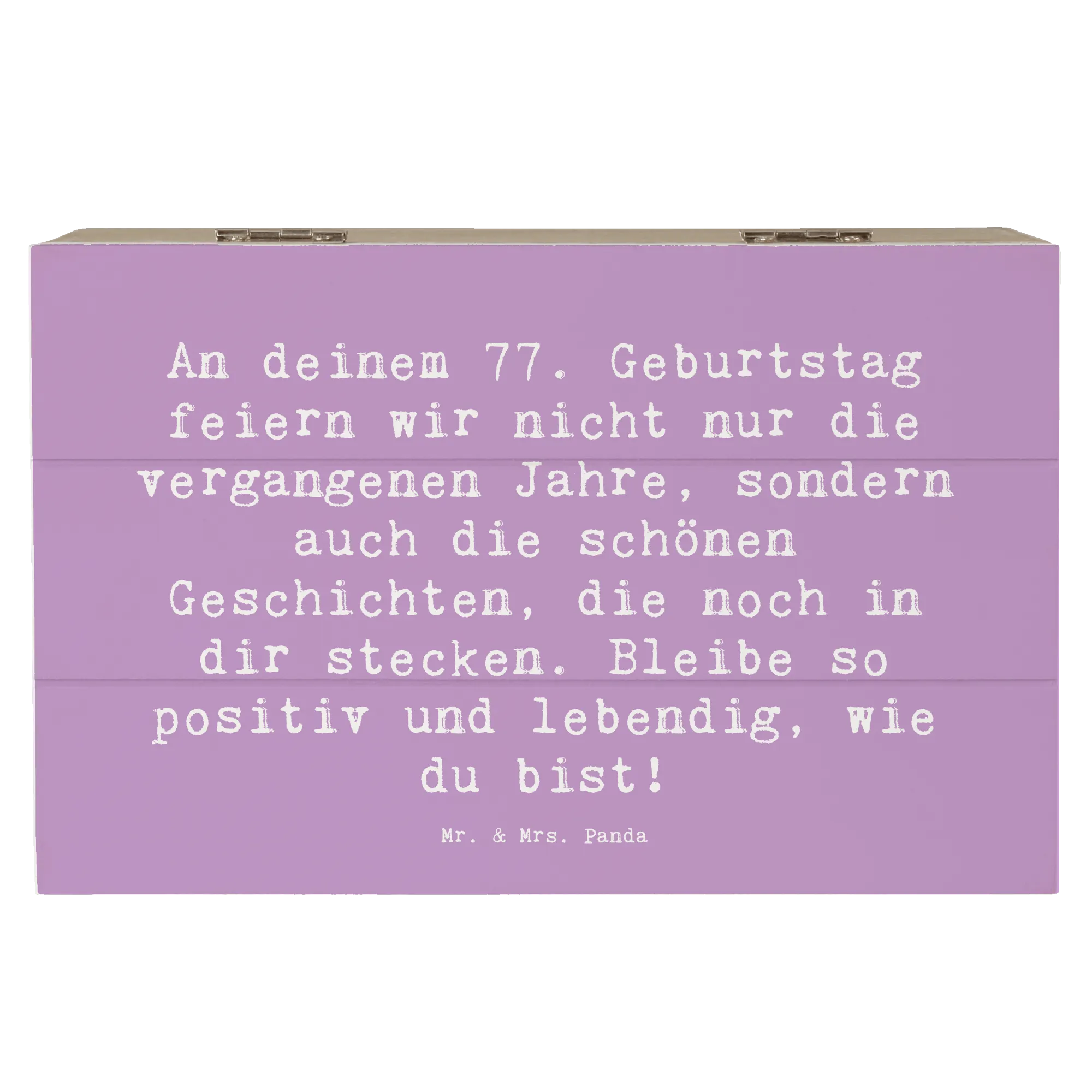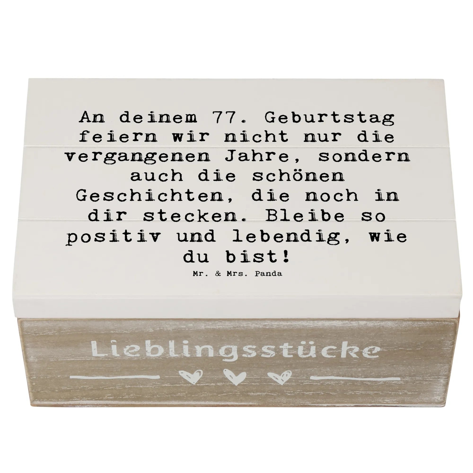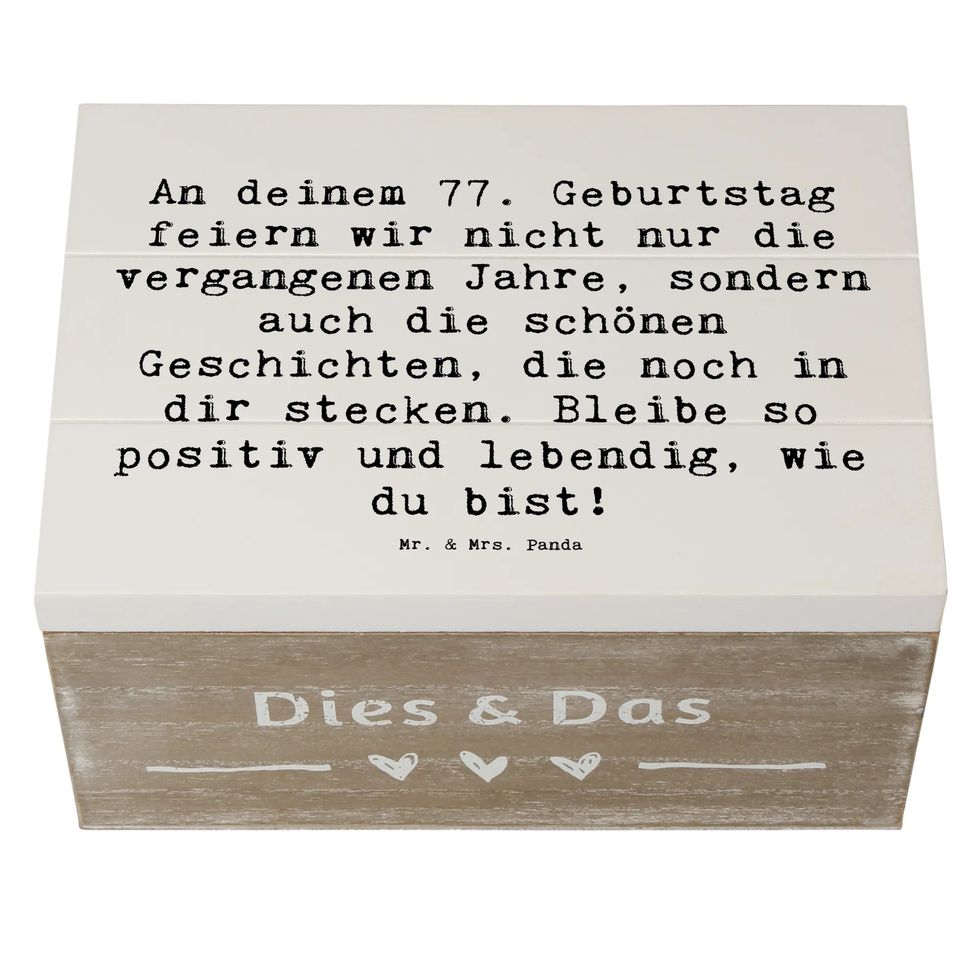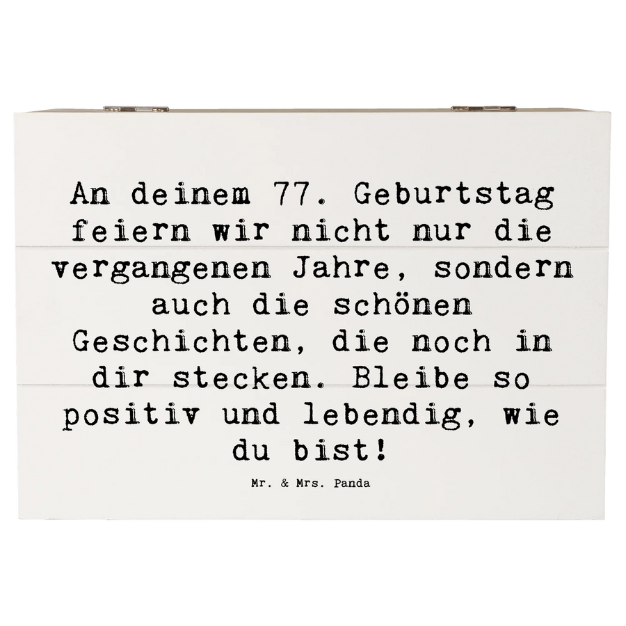 Ein besonderes Geschenk für Familie und Freunde, die ihren 77. Geburtstag gebührend feiern möchten. Schaffe mit der Holzkiste von Mr. & Mrs. Panda unvergessliche Erinnerungen, die ein Leben lang halten! Perfekt zur Nutzung bei Geburtsfeiern, Jubiläen oder einfach als schöne Aufbewahrung für die kleinen und großen Schätze des Lebens.