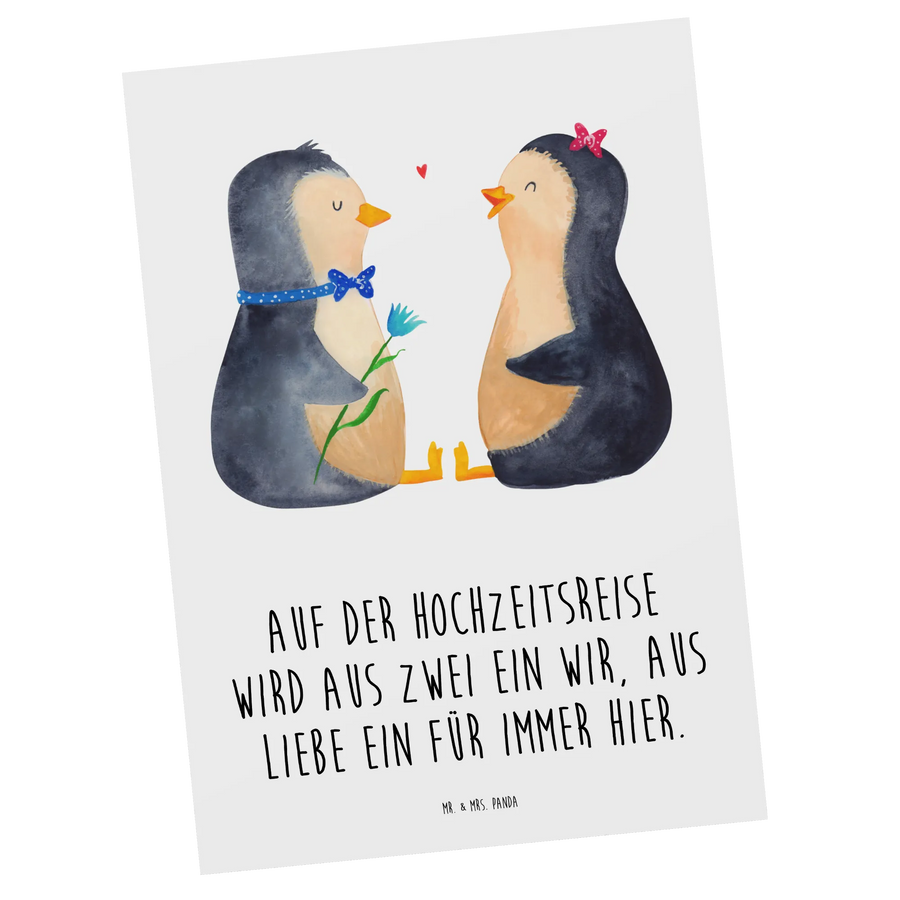 Das süße Design mit den charakteristischen Mr. & Mrs. Panda Motiven ist ideal für Hochzeiten und andere romantische Anlässe. Verschenke diese zauberhafte Postkarte als Dankeskarte, als Einladung zur Hochzeit oder als liebenswürdiges Geschenk zur Verlobung. Die Hochzeitskollektion von Mr. & Mrs. Panda bietet viele weitere tolle Produkte an, die den schönsten Tag im Leben noch unvergesslicher machen. Die Karte sorgt nicht nur für Freude bei den Beschenkten, sondern weckt auch Erinnerungen an einen der aufregendsten Tage. Lasse die Liebe sprechen mit dieser besonderen Postkarte – das ideale Accessoire für jeden romantischen Anlass und eine schöne Erinnerung an die gemeinsamen Erlebnisse. Egal ob für das Brautpaar, die Trauzeugen oder die Gäste, diese Hochzeitsreise Postkarte ist das perfekte Geschenk für jeden, der auf der Suche nach einem liebevollen, persönlichen Mitbringsel ist.
