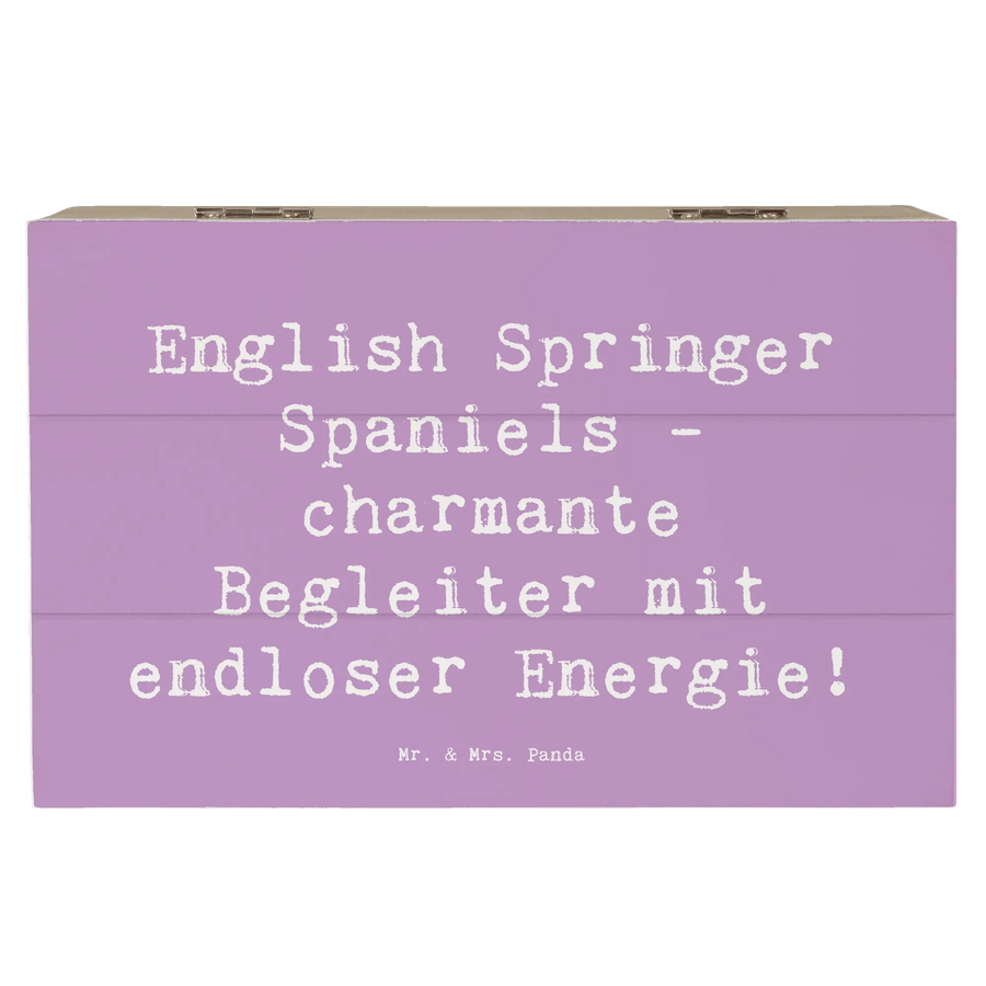 Die Kiste ist mit dem liebevollen Spruch "English Springer Spaniels - charmante Begleiter mit endloser Energie!" bedruckt, was sie zu einem ganz besonderen Geschenk macht. Jedes Motiv wurde von Mrs. Panda handgezeichnet, sodass du ein echtes Unikat erhältst.