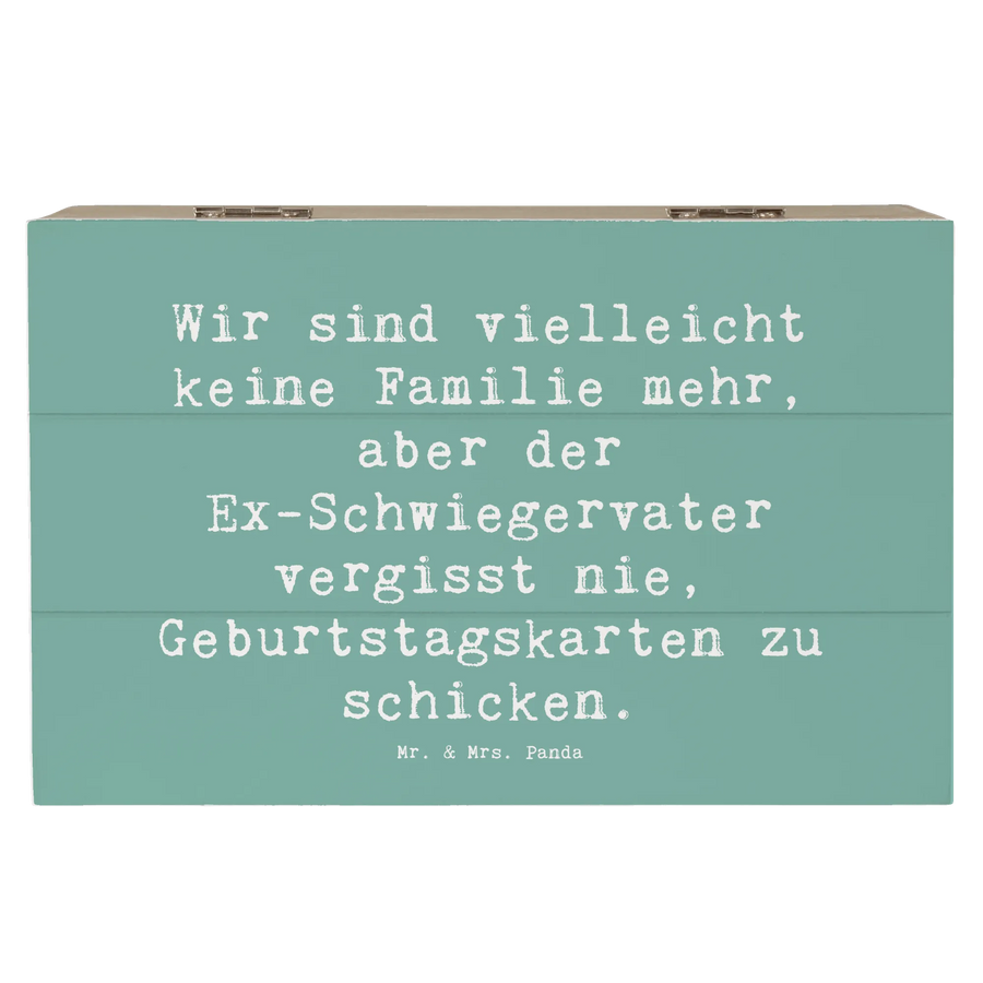 Das hochwertige Material der Kiste verleiht ihr eine edle und nachhaltige Note. Der liebevolle Spruch "Wir sind vielleicht keine Familie mehr, aber der Ex-Schwiegervater vergisst nie, Geburtstagskarten zu schicken." bringt zum Ausdruck, wie wichtig die Verbindung trotz aller Veränderungen ist. Diese Kiste ist nicht nur ein praktisches Aufbewahrungsstück, sondern auch ein wertvolles Erinnerungsstück.