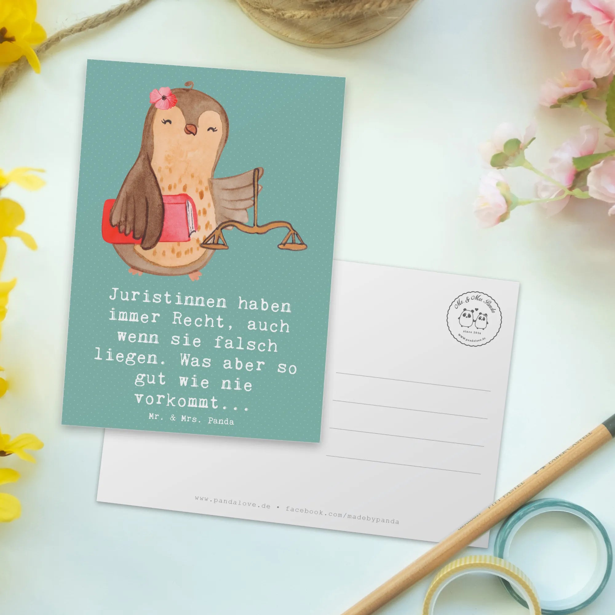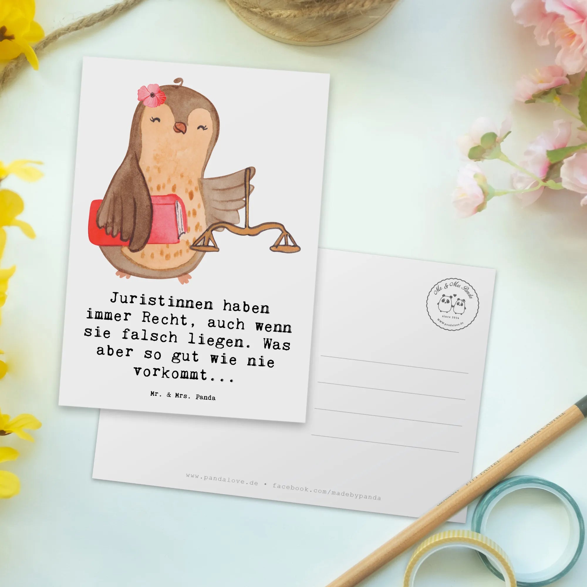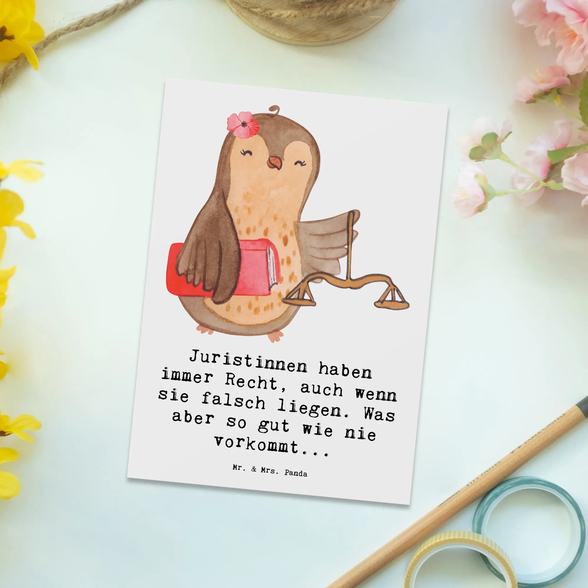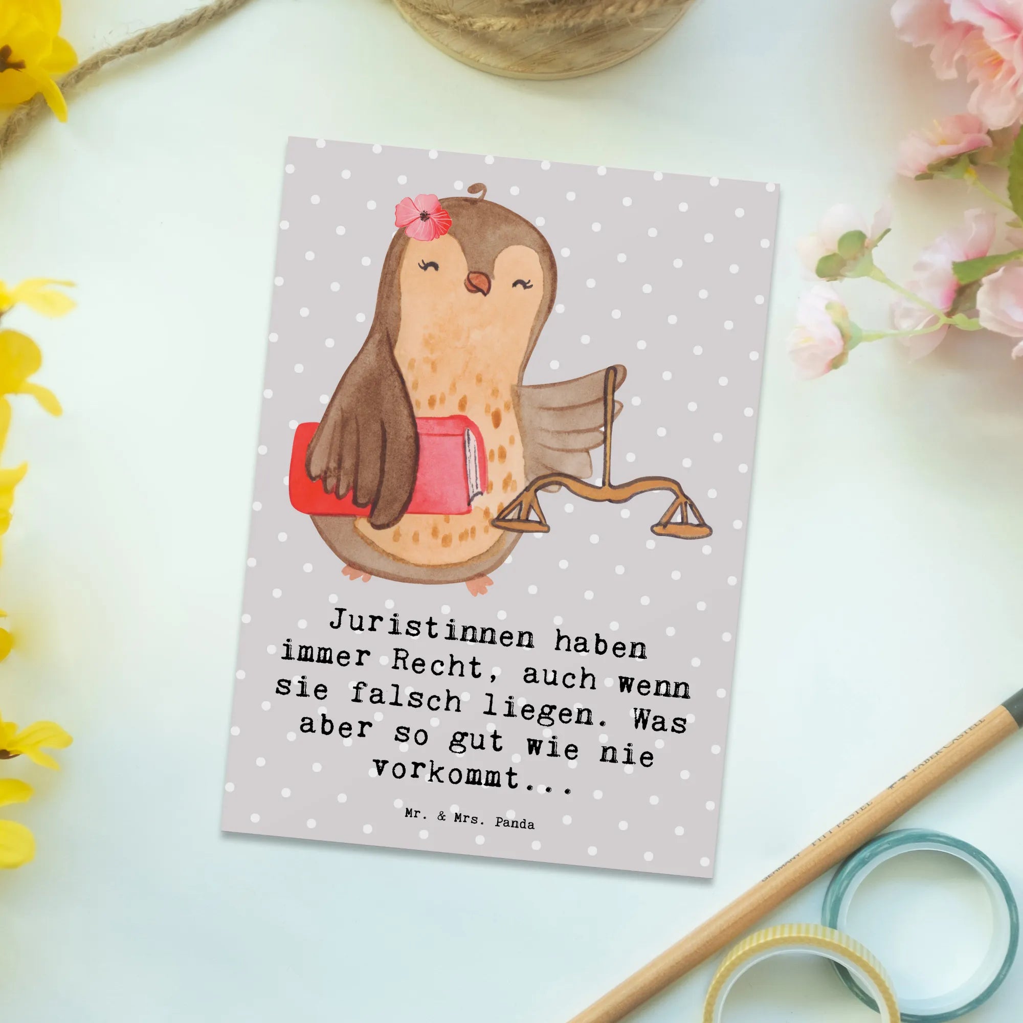 Entdecke die perfekte Postkarte für Juristinnen, die nicht nur schön, sondern auch witzig ist! Die Postkarte "Juristinnen haben immer Recht, auch wenn sie falsch liegen. Was aber so gut wie nie vorkommt..." ist ein echter Hingucker aus der Berufe-Kollektion von Mr. & Mrs. Panda. Sie ist liebevoll gestaltet und eignet sich hervorragend als Grußkarte, Einladungskarte oder einfach, um einem besonderen Menschen eine Freude zu machen.