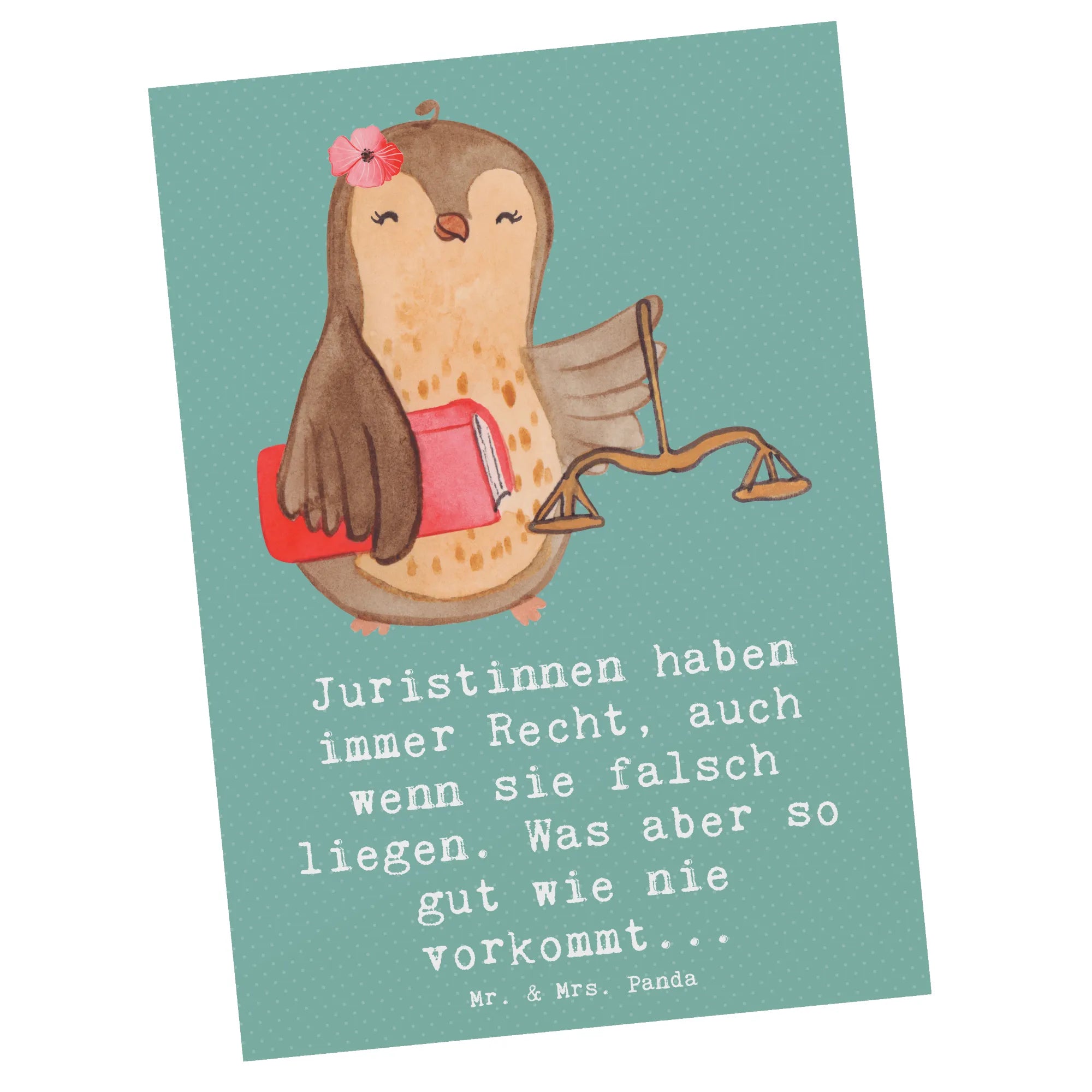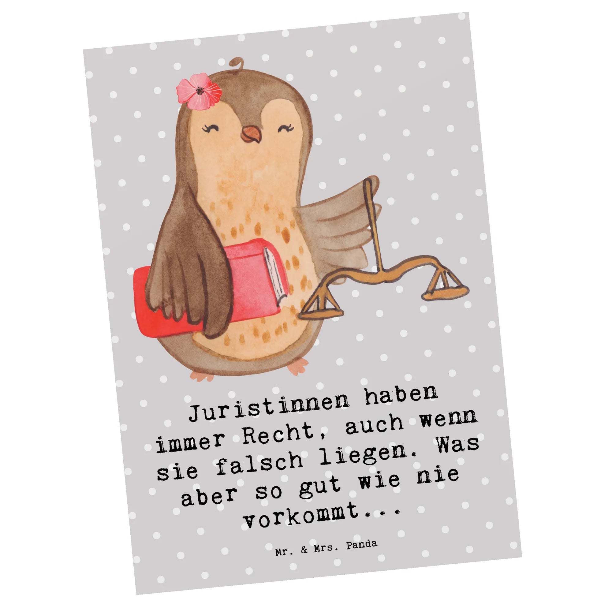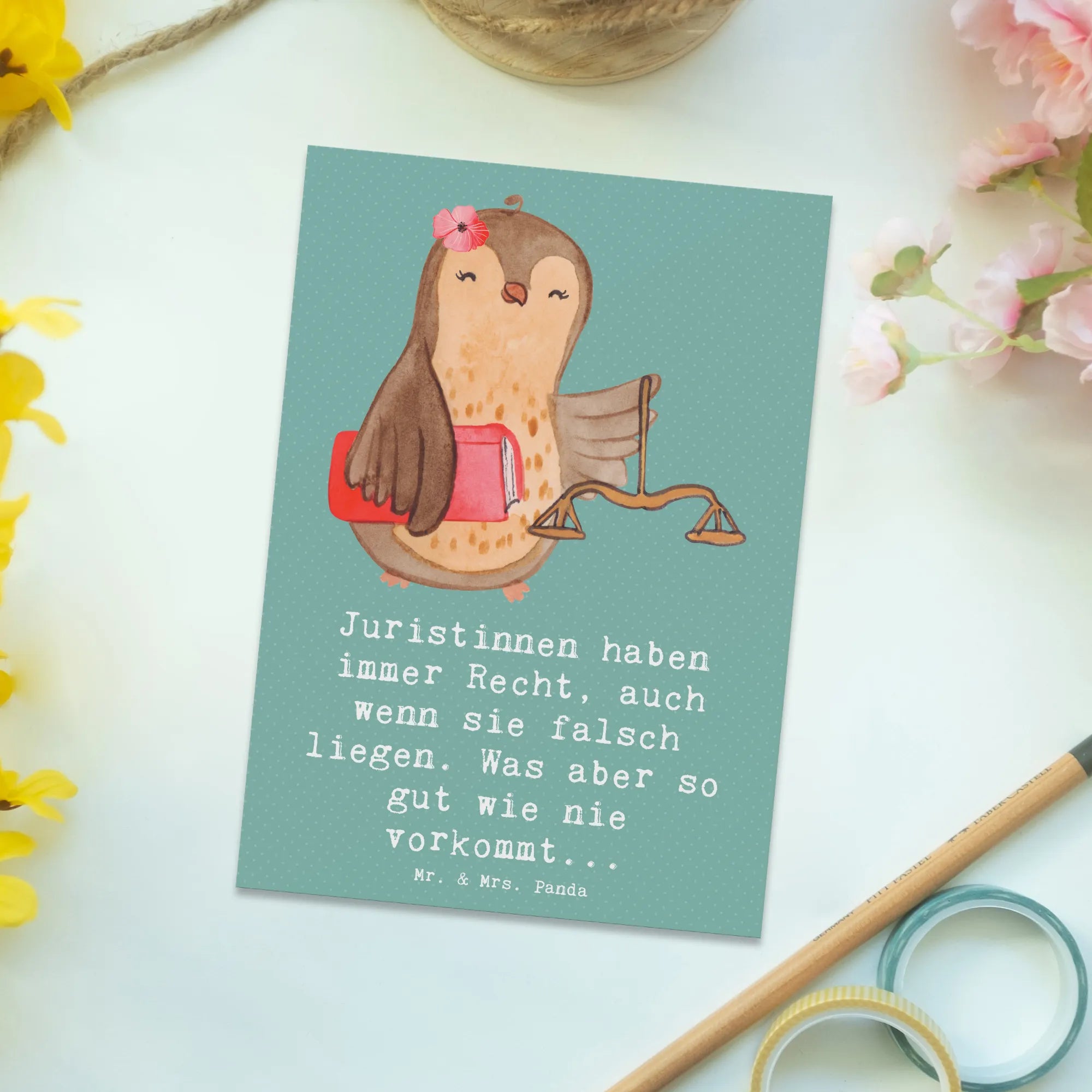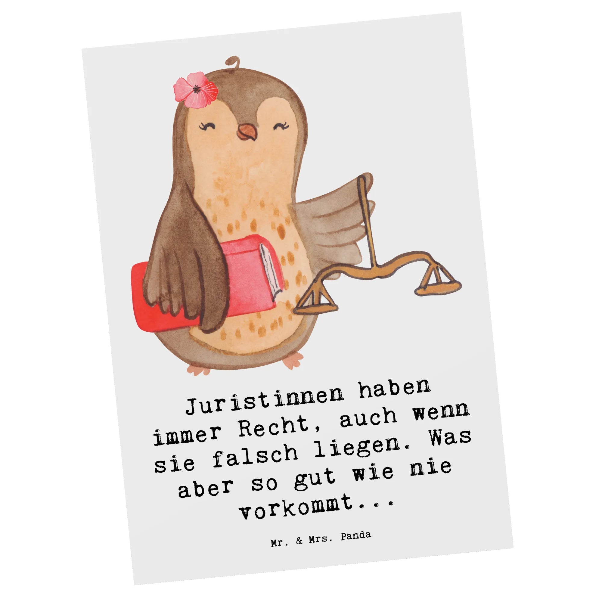 Entdecke die perfekte Postkarte für Juristinnen, die nicht nur schön, sondern auch witzig ist! Die Postkarte "Juristinnen haben immer Recht, auch wenn sie falsch liegen. Was aber so gut wie nie vorkommt..." ist ein echter Hingucker aus der Berufe-Kollektion von Mr. & Mrs. Panda. Sie ist liebevoll gestaltet und eignet sich hervorragend als Grußkarte, Einladungskarte oder einfach, um einem besonderen Menschen eine Freude zu machen.