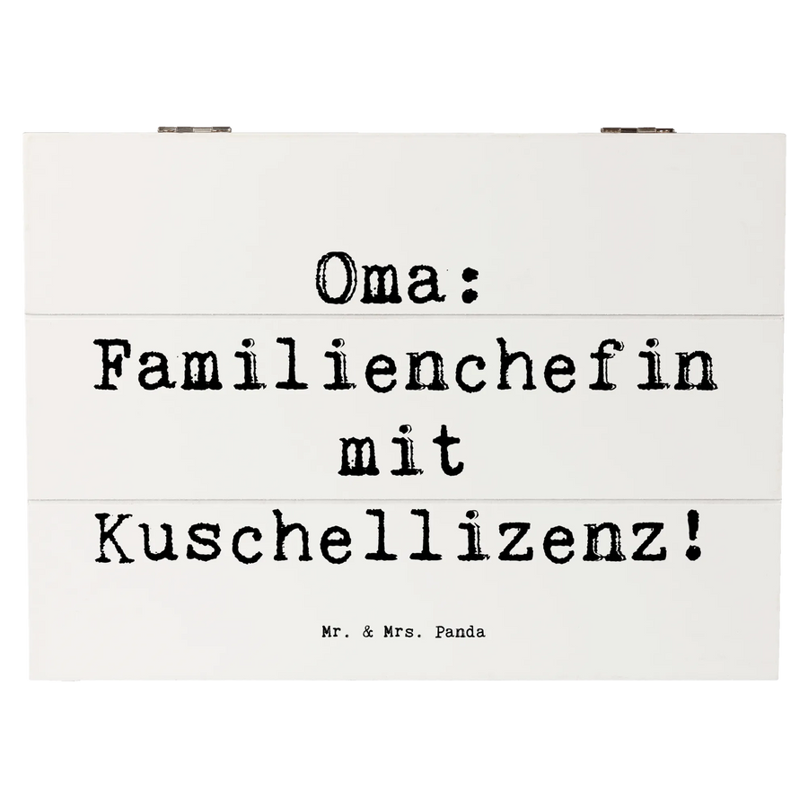 Die wunderschöne Holzkiste von Mr. & Mrs. Panda ist das perfekte Geschenk für Oma! Diese besondere Kiste, bedruckt mit dem liebevollen Spruch "Oma: Familienchefin mit Kuschellizenz!", bietet viel mehr als nur Stauraum.