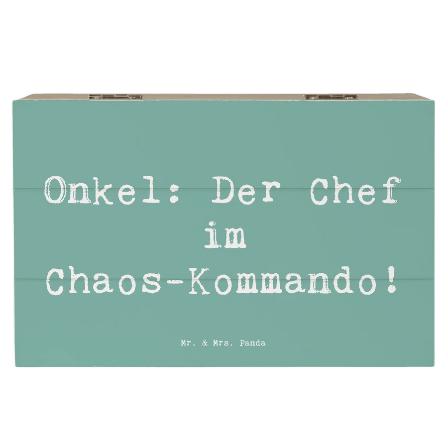 Die wunderschöne Holzkiste mit dem Motiv "Onkel: Der Chef im Chaos-Kommando!" von Mr. & Mrs. Panda ist das perfekte Geschenk für einen besonderen Teil deiner Familie. Diese Erinnerungskiste ist nicht nur ein praktischer Aufbewahrungsort für all die kleinen Schätze aus dem Leben, sondern auch ein liebevolles Dankeschön an deinen Onkel, der immer für ein gutes Wort und viele lustige Geschichten zur Seite steht. Ob für den Geburtstag, als Geschenk zu Weihnachten oder einfach als kleine Überraschung für zwischendurch – diese Kiste ist ein ganz besonderes Highlight.
