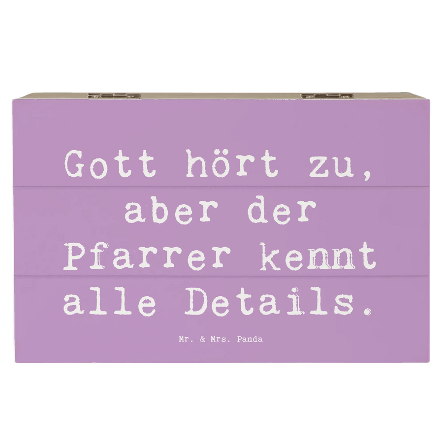 Die Holzkiste "Pfarrer" von Mr. & Mrs. Panda ist das perfekte Geschenk für jeden, der seinen Glauben und seine Berufung liebt. Mit einem liebevoll gestalteten Motiv und dem Spruch "Gott hört zu, aber der Pfarrer kennt alle Details" ist diese Kiste mehr als nur eine Aufbewahrungsbox. Sie wird zum wertvollen Aufbewahrungsort für Erinnerungen und besondere Schätze.