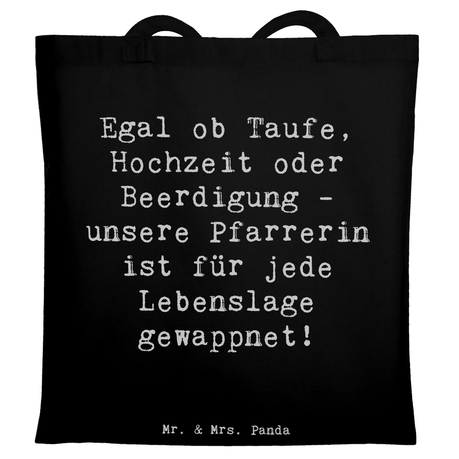 Die perfekte Tragetasche für all jene, die einen besonderen Platz im Leben gefunden haben – die Pfarrerin! Egal ob für den nächsten Gottesdienst, eine Taufe, Hochzeit oder sogar für den Besuch bei Angehörigen – mit unserer Tragetasche von Mr. & Mrs. Panda bist Du immer bestens ausgestattet. Hergestellt aus 100% Baumwolle und hochwertig bedruckt mit dem liebevollen Motiv 'Pfarrerin', begleitet Dich diese Tasche im Alltag und zeigt zugleich Deine Verbundenheit zu diesem hohen Beruf. Die tolle Botschaft 'Egal ob Taufe, Hochzeit oder Beerdigung - unsere Pfarrerin ist für jede Lebenslage gewappnet!' macht sie zu einem ganz besonderen Geschenk für jede Pfarrerin.