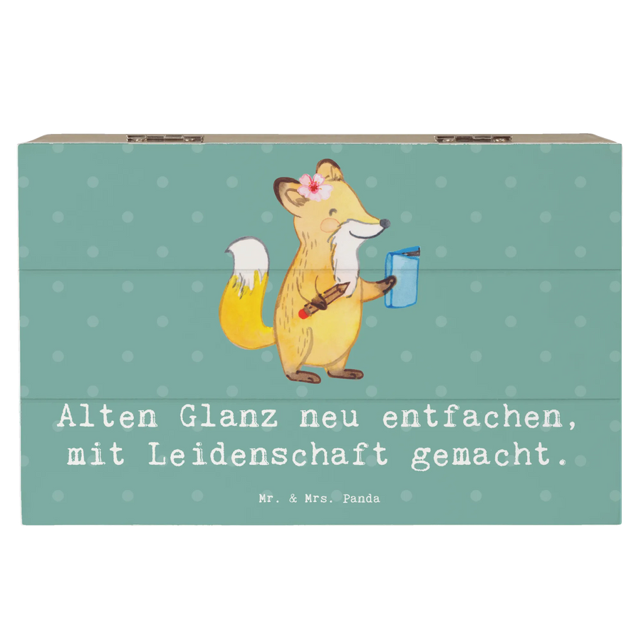 Die hochwertige Holzkiste besteht aus robuster Holzfaser und überzeugt durch ihre Stabilität und Langlebigkeit. Das liebevolle Design mit dem Spruch 'Alten Glanz neu entfachen, mit Leidenschaft gemacht.' spricht Kreative und Handwerksbegeisterte an. Die Arbeit einer Polsterin erfordert Geduld, Präzision und viel Talent; diese Kiste fängt genau dieses Gefühl ein.