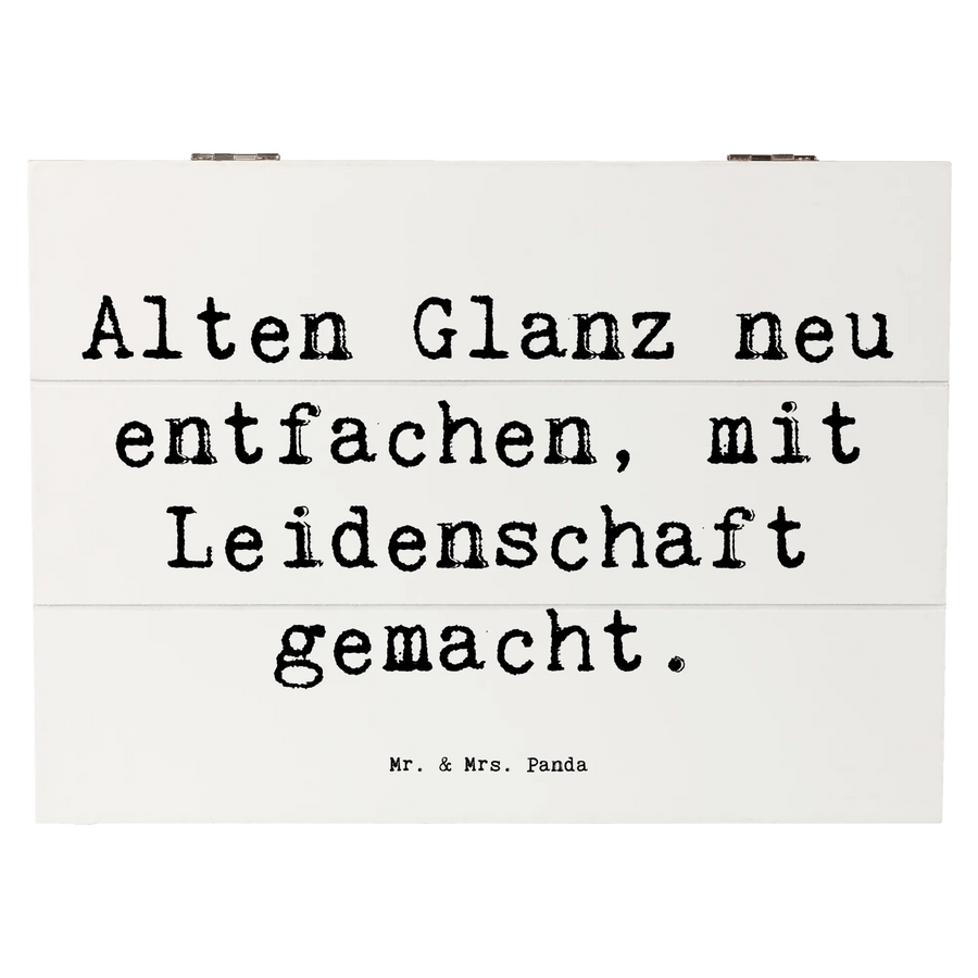 Diese wunderschöne Holzkiste von Mr. & Mrs. Panda ist nicht nur ein einfacher Aufbewahrungsort, sondern ein kleines Kunstwerk, das die Leidenschaft und das handwerkliche Können von Polsterinnen feiert. Mit ihrem liebevoll gestalteten Motiv und dem inspirierenden Spruch "Alten Glanz neu entfachen, mit Leidenschaft gemacht" ist diese Erinnerungsbox ein perfektes Geschenk für jede Gelegenheit.