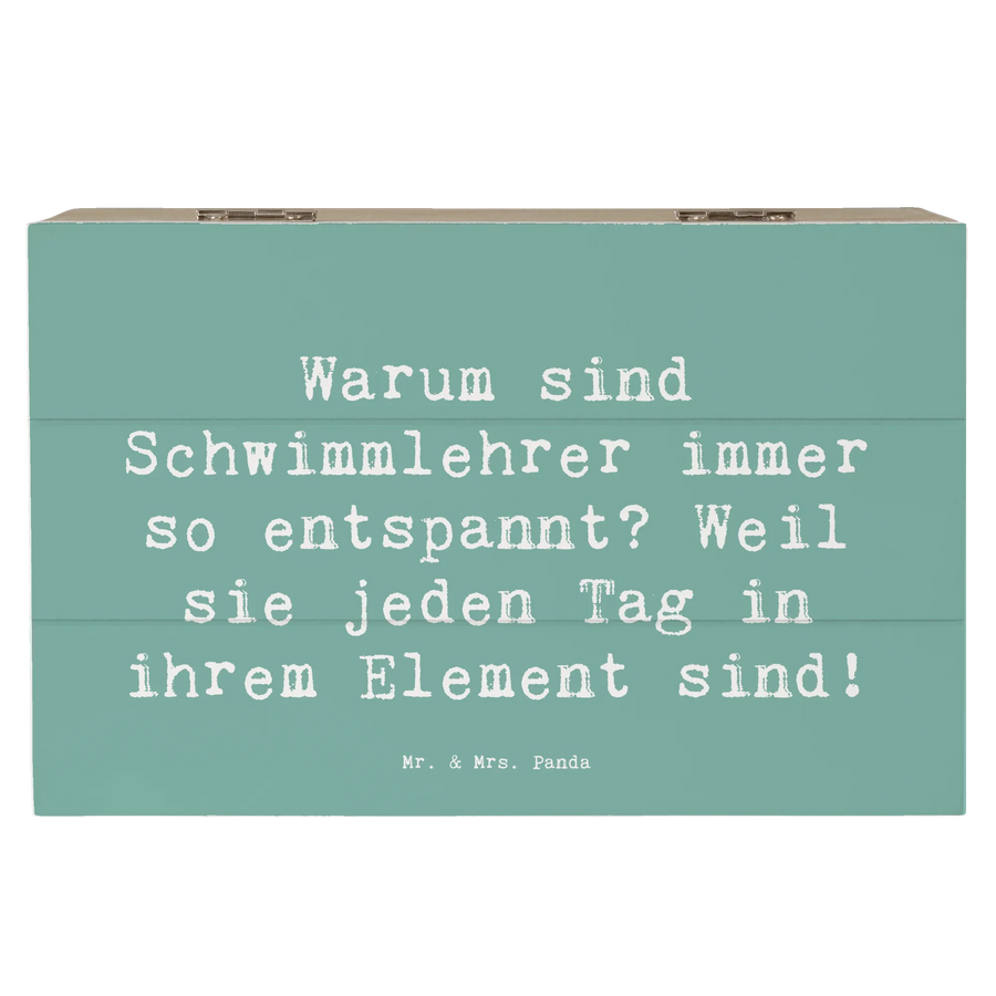 Die wunderschöne Holzkiste von Mr. & Mrs. Panda ist das perfekte Geschenk für Schwimmlehrer und alle, die das Element Wasser lieben! Mit einem liebevoll gestalteten Motiv und dem Spruch "Warum sind Schwimmlehrer immer so entspannt? Weil sie jeden Tag in ihrem Element sind!" bringst Du ein Stück Entspannung und Freude in jeden Raum.