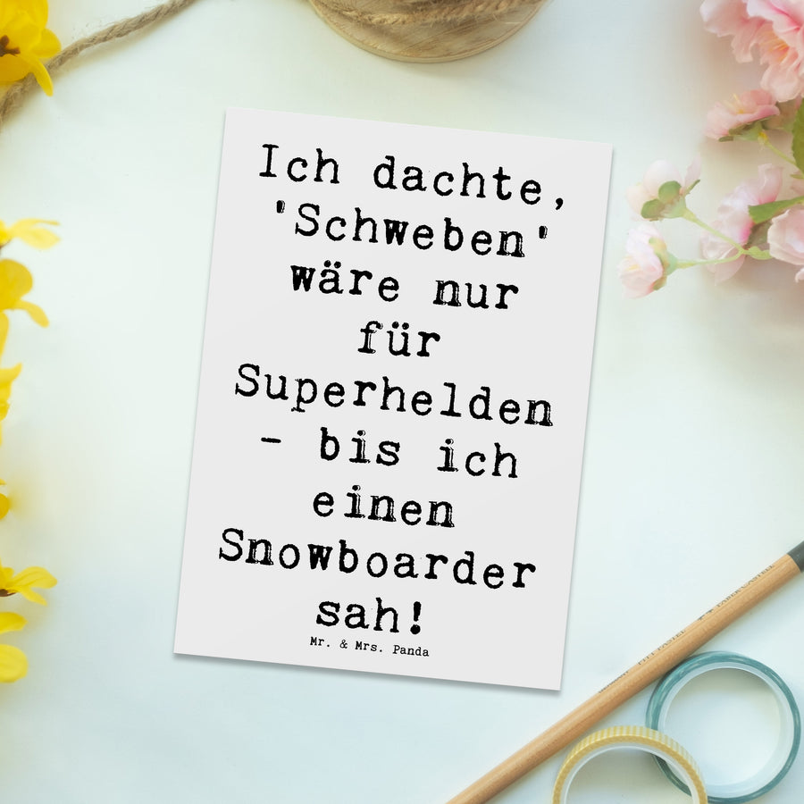 Entdecke die perfekte Grußkarte für jeden Snowboard-Fan aus der beliebten Kollektion von Mr. & Mrs. Panda! Diese einzigartige Postkarte mit dem Motiv 'Snowboarden' begeistert nicht nur durch ihr ansprechendes Design, sondern auch durch den humorvollen Spruch: "Ich dachte, 'Schweben' wäre nur für Superhelden - bis ich einen Snowboarder sah!". Damit bringst Du garantiert ein Lächeln auf das Gesicht des Empfängers!