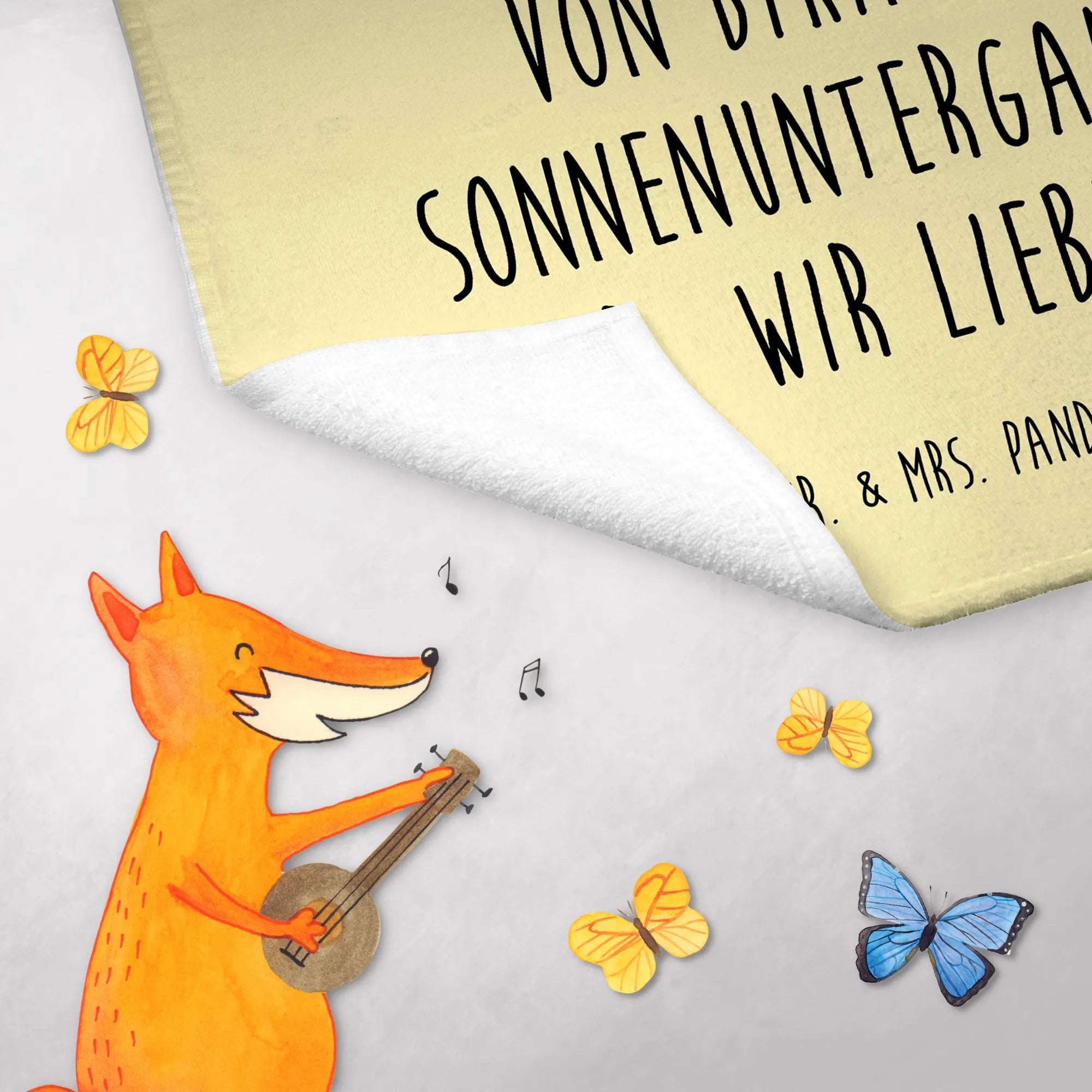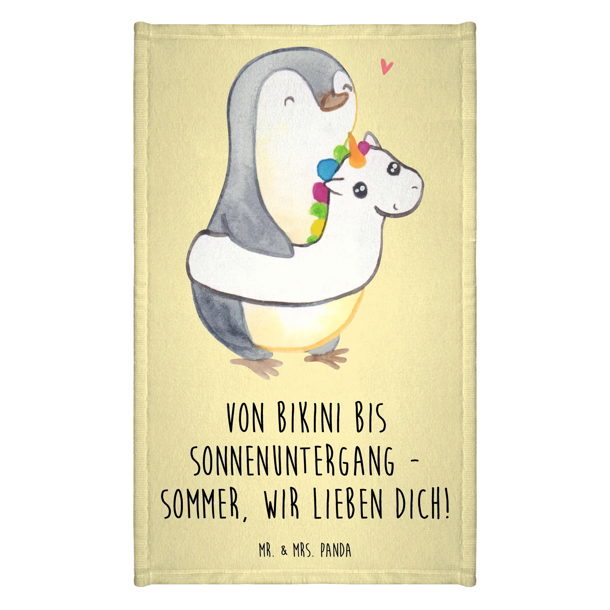 Das Gästetuch Sommer, Meer & Strand von Mr. & Mrs. Panda ist der perfekte Begleiter für deinen nächsten Strandurlaub oder die warme Sommerzeit. Mit seinem bunten, fröhlichen Design, das mit dem liebevollen Slogan "Von Bikini bis Sonnenuntergang - Sommer, wir lieben dich!" geschmückt ist, strahlt es pure Lebensfreude aus. Die hochwertigen Baumwollmaterialien garantieren ein samtweiches Gefühl auf der Haut, während die lebhaften Farben jedes Badezimmer aufhellen.