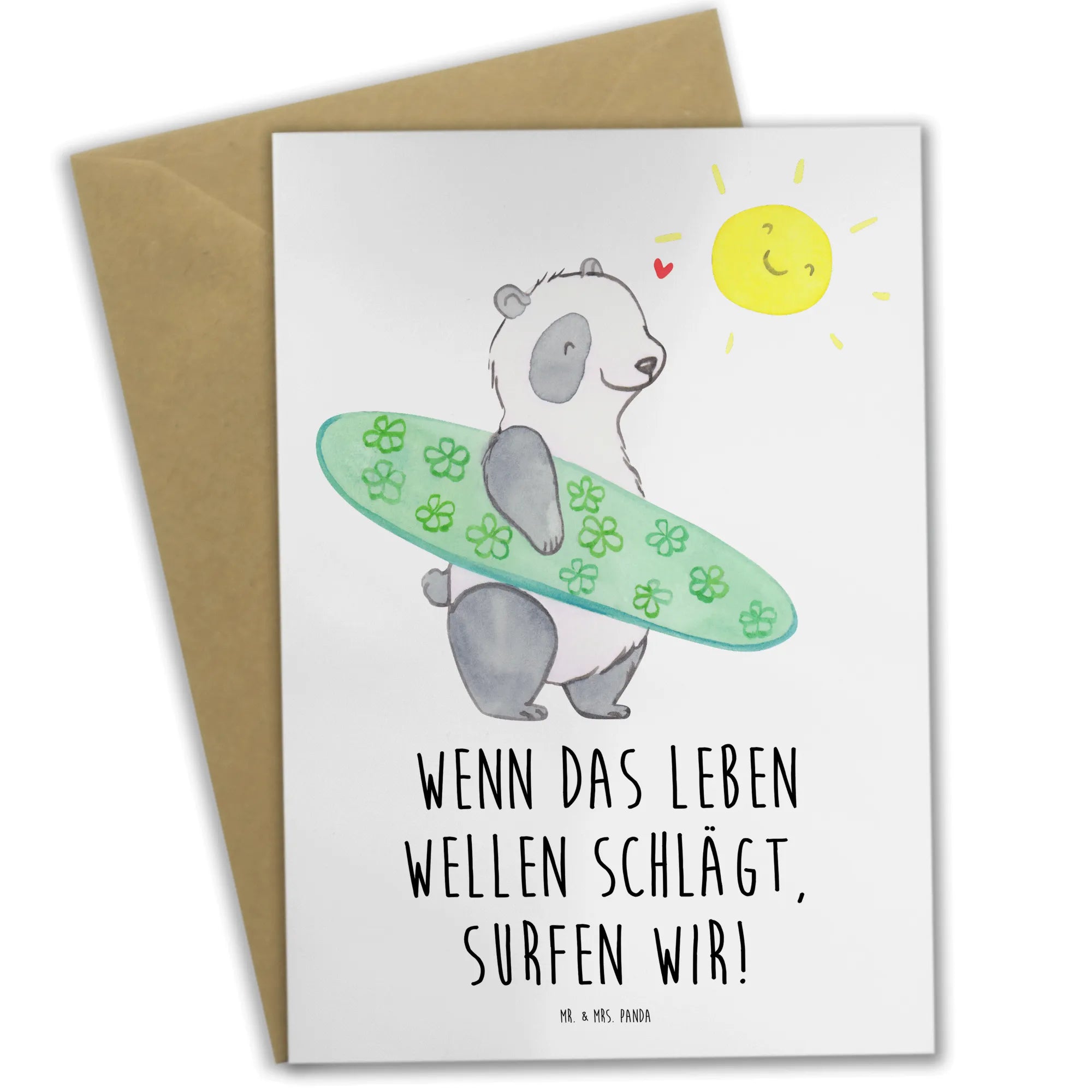 Die wunderschöne Grußkarte von Mr. & Mrs. Panda bringt den Zauber des Sommers direkt zu Dir nach Hause! Mit dem strahlenden Motiv "Sommer, Meer & Strand" aus der exklusiven Kollektion Jahreszeiten schlägst Du gleich mehrere Fliegen mit einer Klappe. Sie ist ideal für viele Anlässe – sei es ein Geburtstag, eine Hochzeit oder einfach nur, um jemandem zu sagen, wie sehr Du ihn schätzt. Die Karte zaubert ein Lächeln auf jedes Gesicht, denn der Slogan "Wenn das Leben Wellen schlägt, surfen wir!" erinnert uns daran, das Leben in vollen Zügen zu genießen.