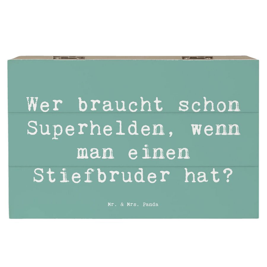 Die wunderschöne Holzkiste von Mr. & Mrs. Panda ist das perfekte Geschenk für deinen Stiefbruder! Mit dem charmanten Spruch "Wer braucht schon Superhelden, wenn man einen Stiefbruder hat?" zeigt diese Erinnerungskiste, wie besonders die Beziehung zu einem Stiefgeschwisterteil sein kann.