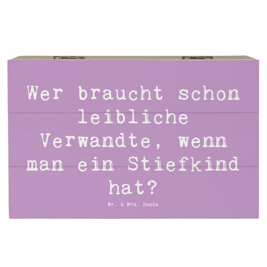 Entdecke die wundervolle Holzkiste von Mr. & Mrs. Panda, die mit dem herzlichen Spruch "Wer braucht schon leibliche Verwandte, wenn man ein Stiefkind hat?" versehen ist. Diese IXl-XXL Erinnerungskiste ist mehr als nur ein Aufbewahrungsort – sie ist ein Symbol für die Liebe und Zugehörigkeit in Patchworkfamilien.