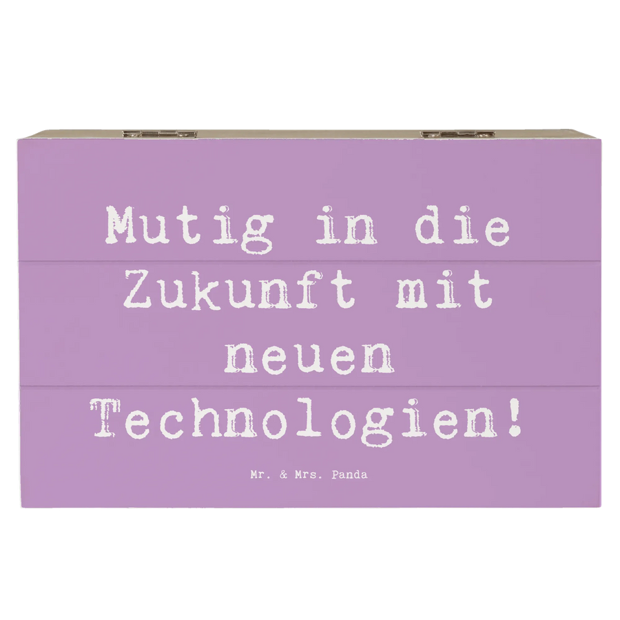 Mit dem ermutigenden Slogan 'Mutig in die Zukunft mit neuen Technologien!' inspiriert sie dazu, neue Wege zu gehen und Herausforderungen anzugehen. Diese Holzkiste ist Teil der 'Mutmacher'-Kollektion von Mr. & Mrs. Panda, die Produkte bietet, die Trost und Zuversicht spenden.