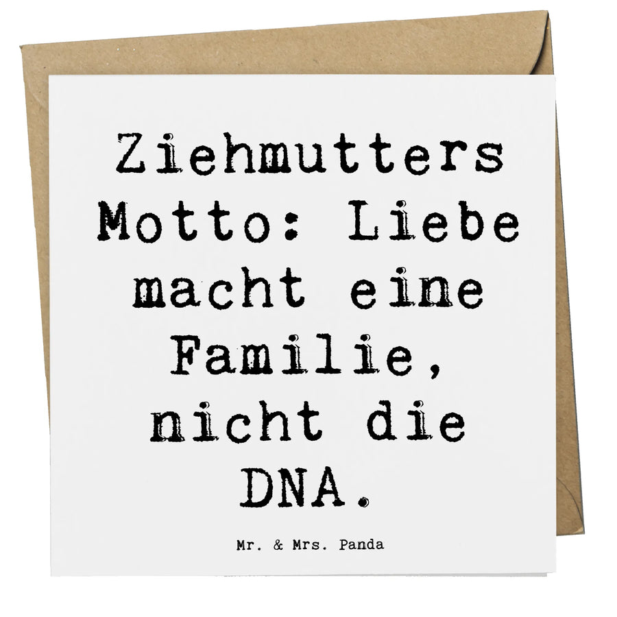 Auf der Vorderseite der Karte strahlt das Motiv zusammen mit dem liebevollen Spruch "Ziehmutters Motto: Liebe macht eine Familie, nicht die DNA." Dieser Spruch erinnert an die wahre Bedeutung familiärer Bindungen und ehrt die besonderen Frauen, die sich um Kinder kümmern, die sie nicht durch Geburt verbunden sind.