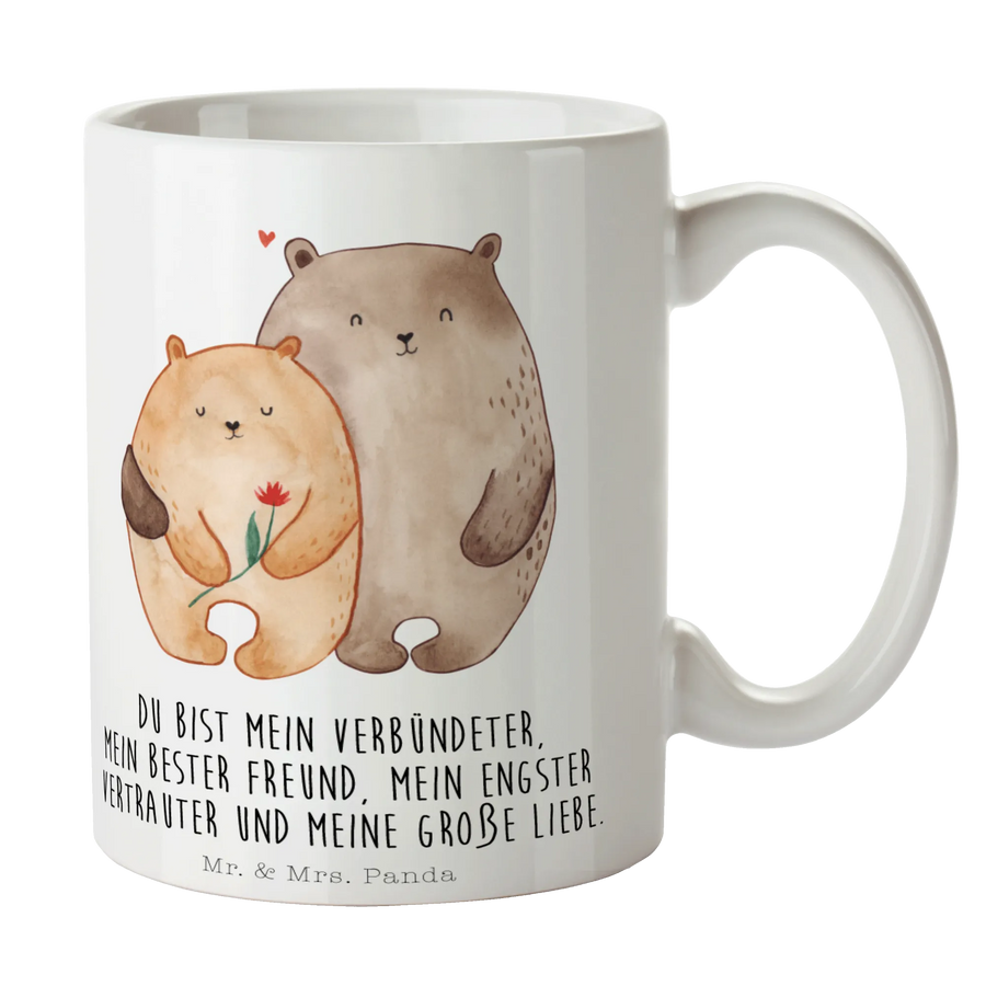 Mr. & Mrs. Panda Tasse „Bären Liebe“ – ein kleines, großes Geschenk für Verliebte. Diese Kaffeetasse mit Spruch zeigt zwei niedliche Bären, die zusammen ein Herz formen. Der liebevolle Text „Du bist mein Verbündeter, Mein bester Freund, mein engster Vertrauter und meine große Liebe.“ macht die Tasse zum perfekten Liebesgeschenk für Freundin, Freund oder den Ehepartner.