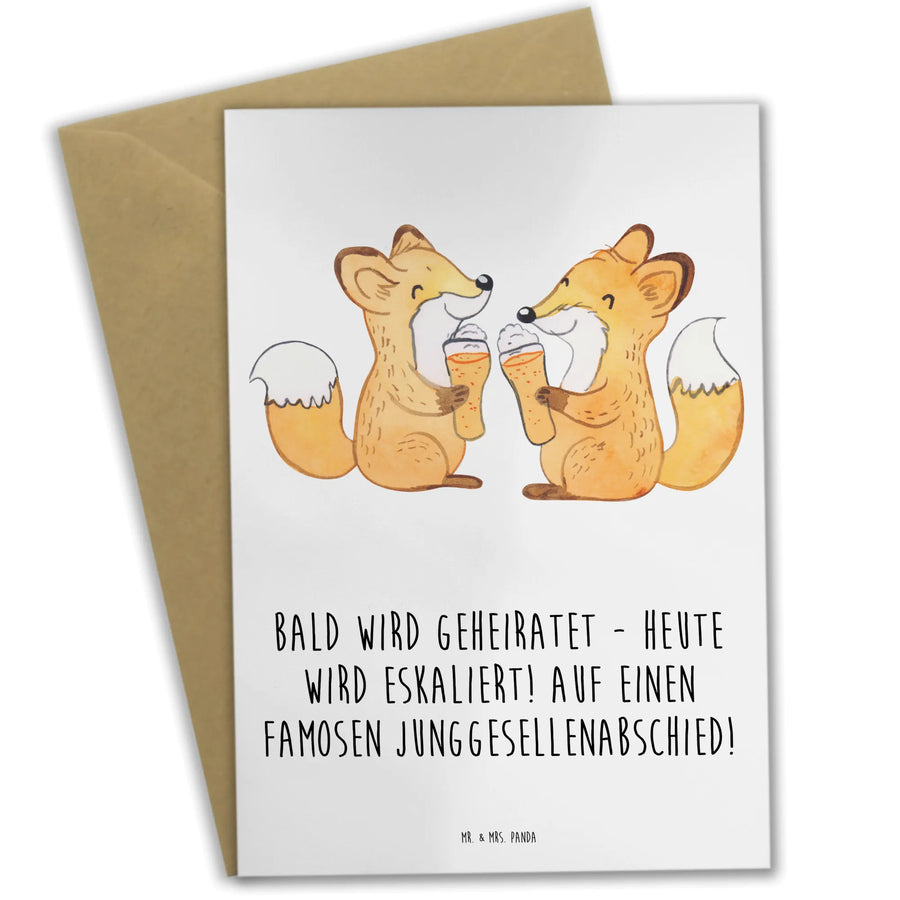 Entdecke unsere einzigartige Grußkarte zum Junggesellenabschied aus der wundervollen Hochzeitskollektion von Mr. & Mrs. Panda! Diese Karte ist das perfekte Geschenk für alle, die beim Feiern des letzten großen Abenteuers vor der Hochzeit nicht auf das richtige Motiv verzichten möchten. Bedruckt mit dem unterhaltsamen Spruch "Bald wird geheiratet - heute wird eskaliert! Auf einen famosen Junggesellenabschied!" sorgt sie sofort für gute Laune und zünftige Stimmung.