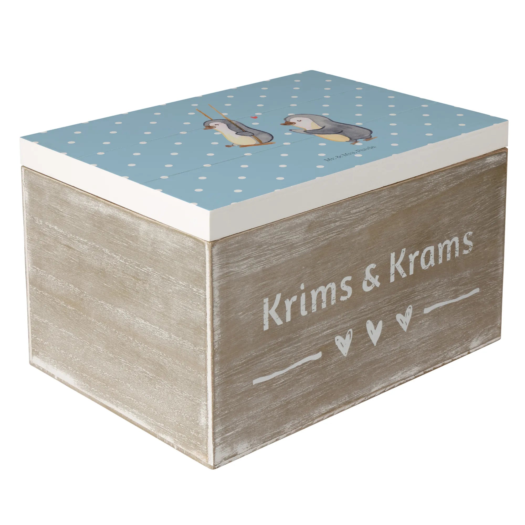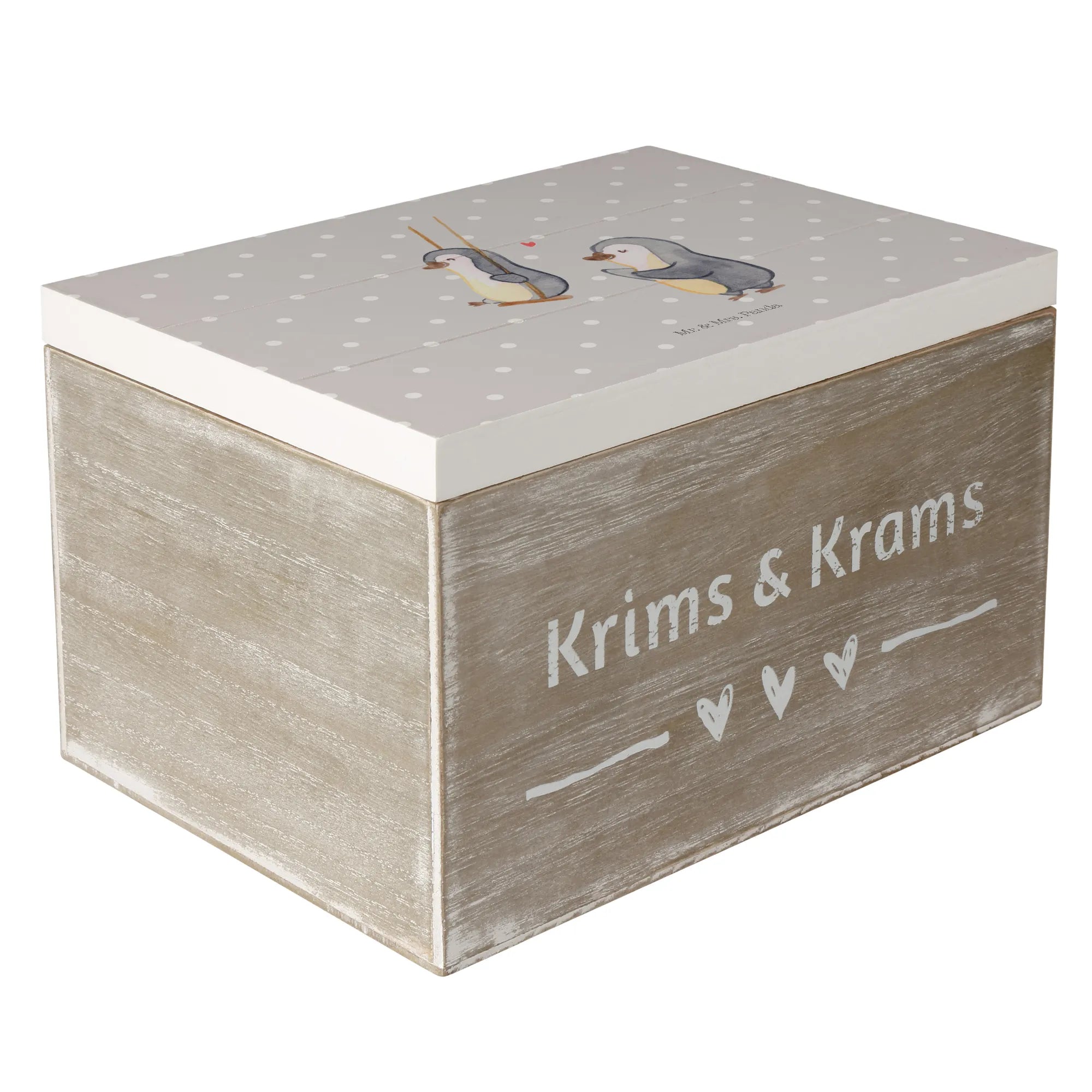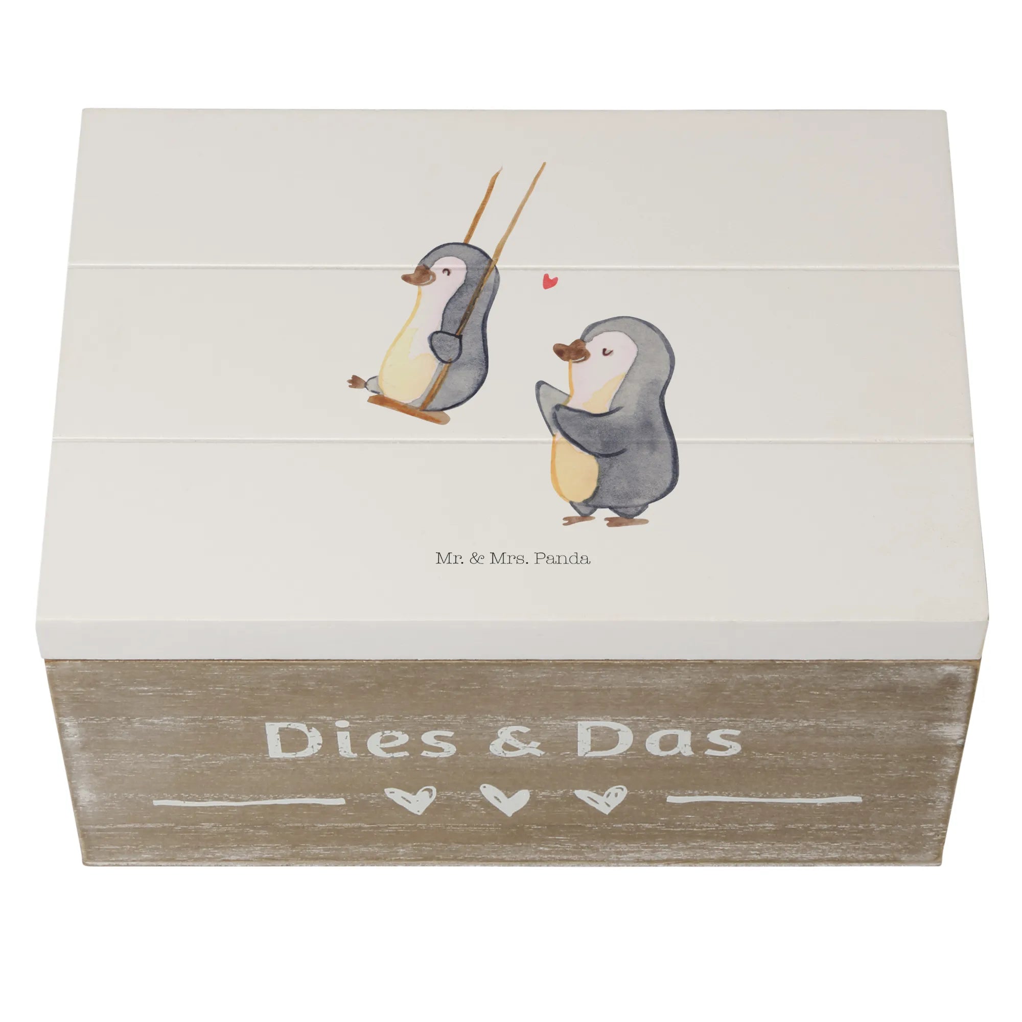 Entdecke unsere zauberhafte Holzkiste mit dem liebevollen Motiv 'Pinguin Oma schaukeln' von Mr. & Mrs. Panda! Diese Holzkiste ist die perfekte Erinnerungskiste, um die schönsten Erlebnisse mit deiner liebsten Oma festzuhalten.
