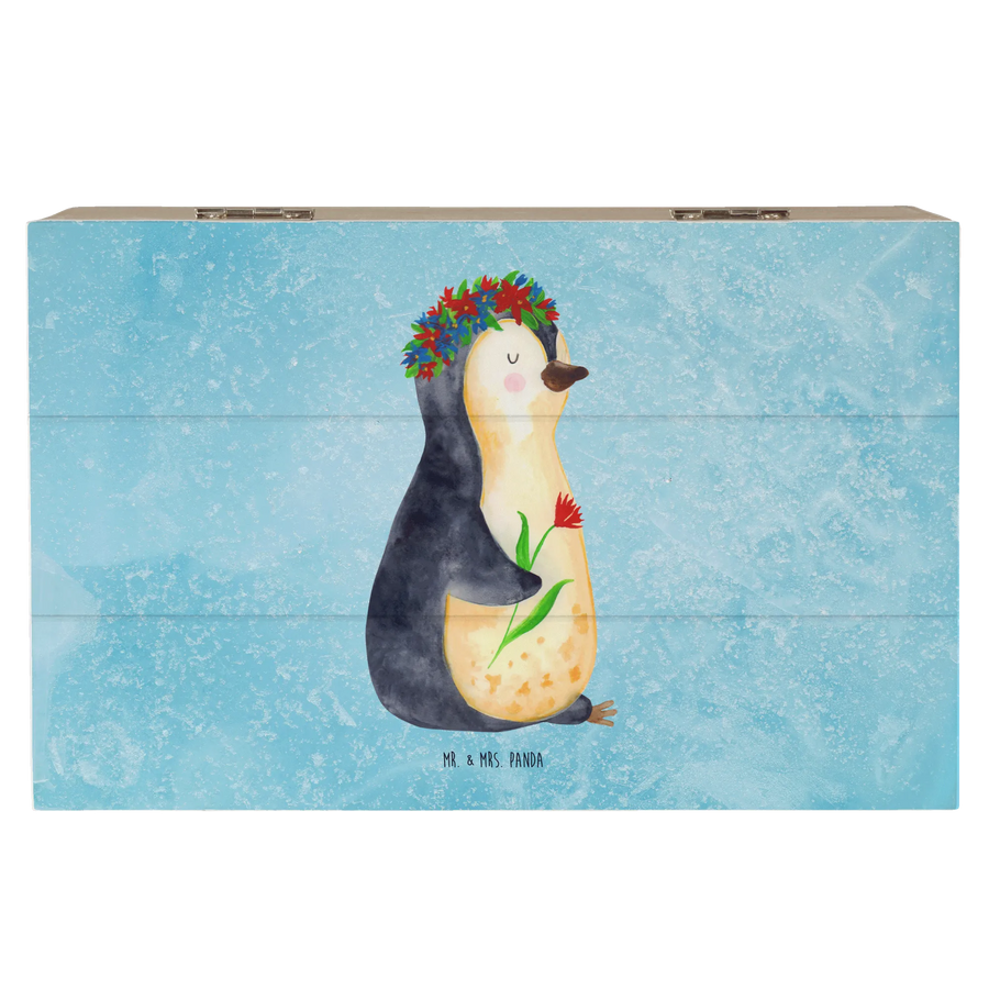 Eine wunderschöne Holzkiste von Mr. & Mrs. Panda: Das Motiv „Pinguin Blumenkranz“ aus der Pinguin - Kollektion zaubert sofort ein Lächeln. Ein süßer Pinguin mit Blumenkranz und Blume in der Hand symbolisiert Lebenslust, Sanftmut und kleine Glücksmomente – ideal als Geschenkidee für Freundinnen, Kinder oder als tröstende Aufmerksamkeit bei Liebeskummer.