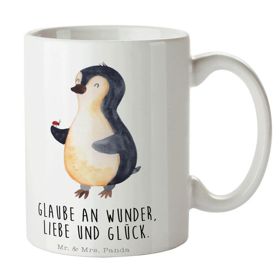 Mit dem Slogan "Glaube an Wunder, Liebe und Glück" bringt die Tasse eine positive Botschaft mit, die jeden Tag ein wenig heller macht. Die Pinguin Kollektion von Mr. & Mrs. Panda bietet eine Vielzahl an Motiven, die auf liebevolle Weise das Herz erwärmen und die Seele aufhellen. Wenn du nach einem einzigartigen Geschenk für Pinguin-Liebhaber oder einfach für jemanden, der gute Laune verbreiten soll, suchst – diese Tasse ist genau das Richtige!