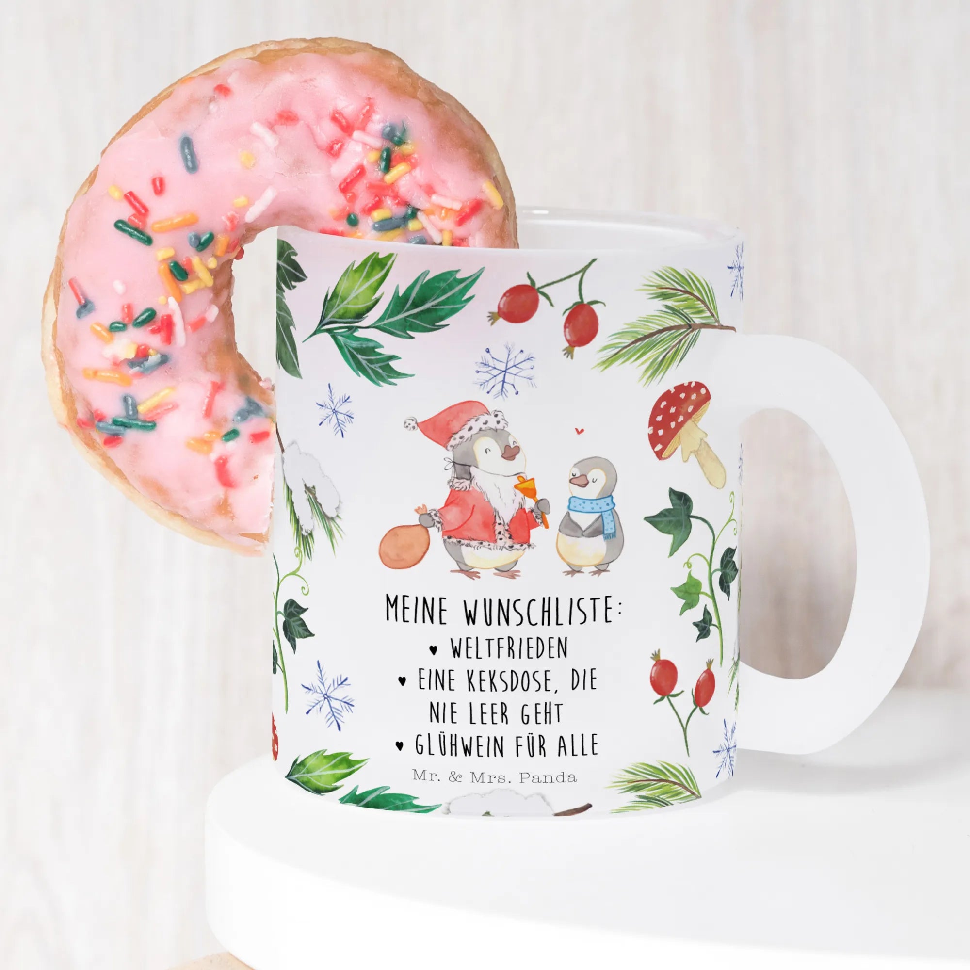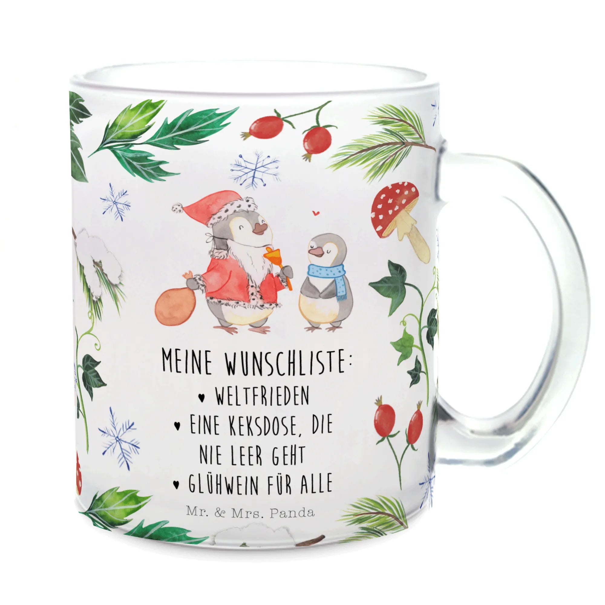 Die Teetasse Pinguin Wunschliste aus der Winter Kollektion von Mr. & Mrs. Panda ist das perfekte Geschenk für die kalte Jahreszeit! Diese edle Teetasse, aus robustem, extra starkem Premiumglas, bringt nicht nur dein Lieblingsgetränk, sondern auch ein Lächeln auf dein Gesicht. Der süße Pinguin, der sich als Nikolaus verkleidet hat, bringt fröhliche Weihnachtsstimmung direkt in dein Zuhause.